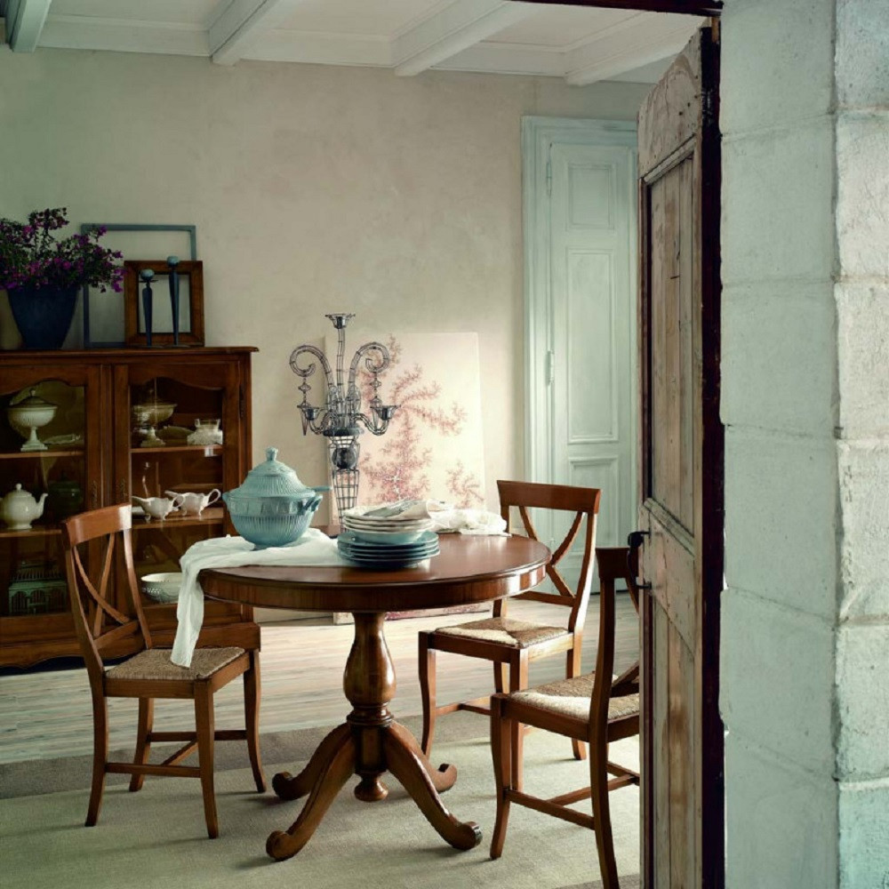 Tavolo rotondo fisso con gambone centrale tornito sostenuto da quattro piedi sagomati.