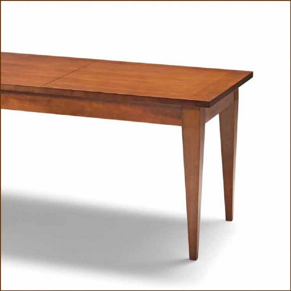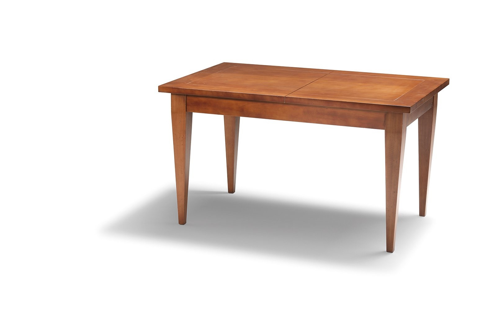 Tavolo rettangolare allungabile con apertura al centro, dotato di una allunga da cm 45, gambe a spillo di importante consistenza , il piano del tavolo viene riquadrato come foto . La forma semplice lo rende adatto ad ogni tipo di arredamento.