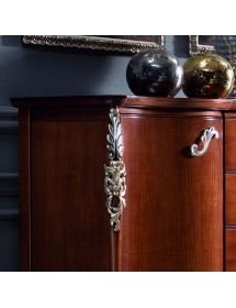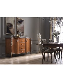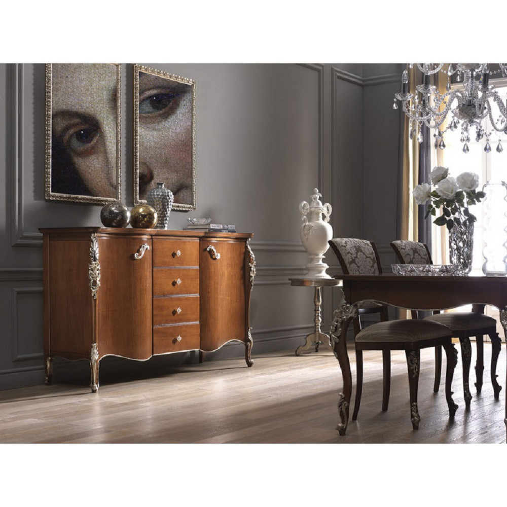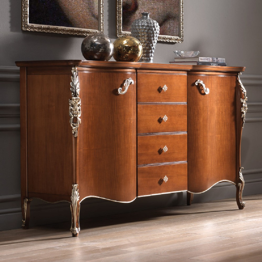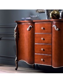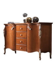 Credenza con due ante e quattro cassetti, spalle sagomate con evidente intaglio nella parte superiore ed inferiore. Piano sagomato con cornice e base alzata da terra da piedini che terminano a ricciolo. Questa credenza è destinata ad una casa esclusiva e di classe. Le forme delicate ma importanti sono decorate da dettagli riccamente intagliati.