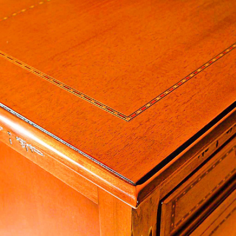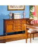 Credenza con due ante, quattro cassetti al centro e due cassetti più grandi ai lati. Piano sporgente dal perimetro del mobile con fascia sottostante incisa a motivi floreali. Ante e frontale dei cassetti arricchiti da filettature colorate. Montanti delle spalle con unghiate, piedi a spillo. Ante, frontali dei cassetti e fianchi riquadrati con cornici a più sagome.