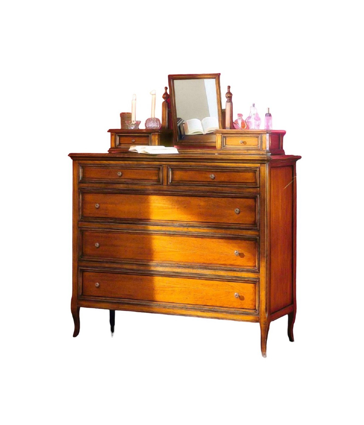 Cassettiera con tre cassetti grandi e due piccoli , un'alzatina con due cassetti ed uno specchio. Montanti delle spalle arrotondati che proseguono con una gambetta sagomata. Frontali dei cassetti e fianchi riquadrati con cornici sagomate.