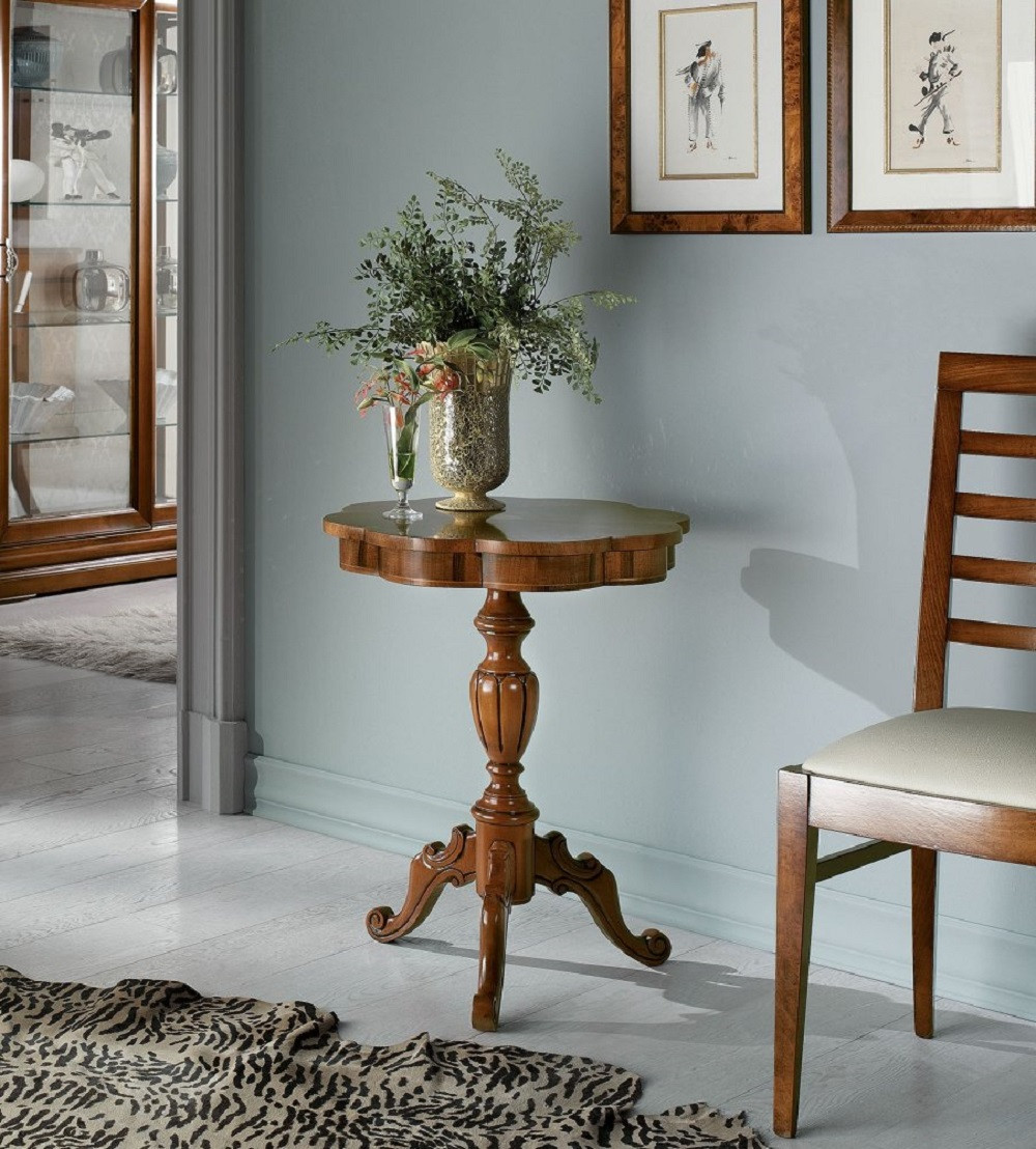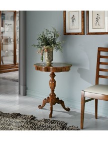 Tavolino rotondo "Fiore" intarsiato con gambone a 3 piedi.