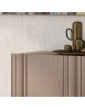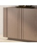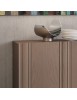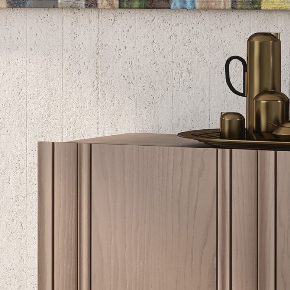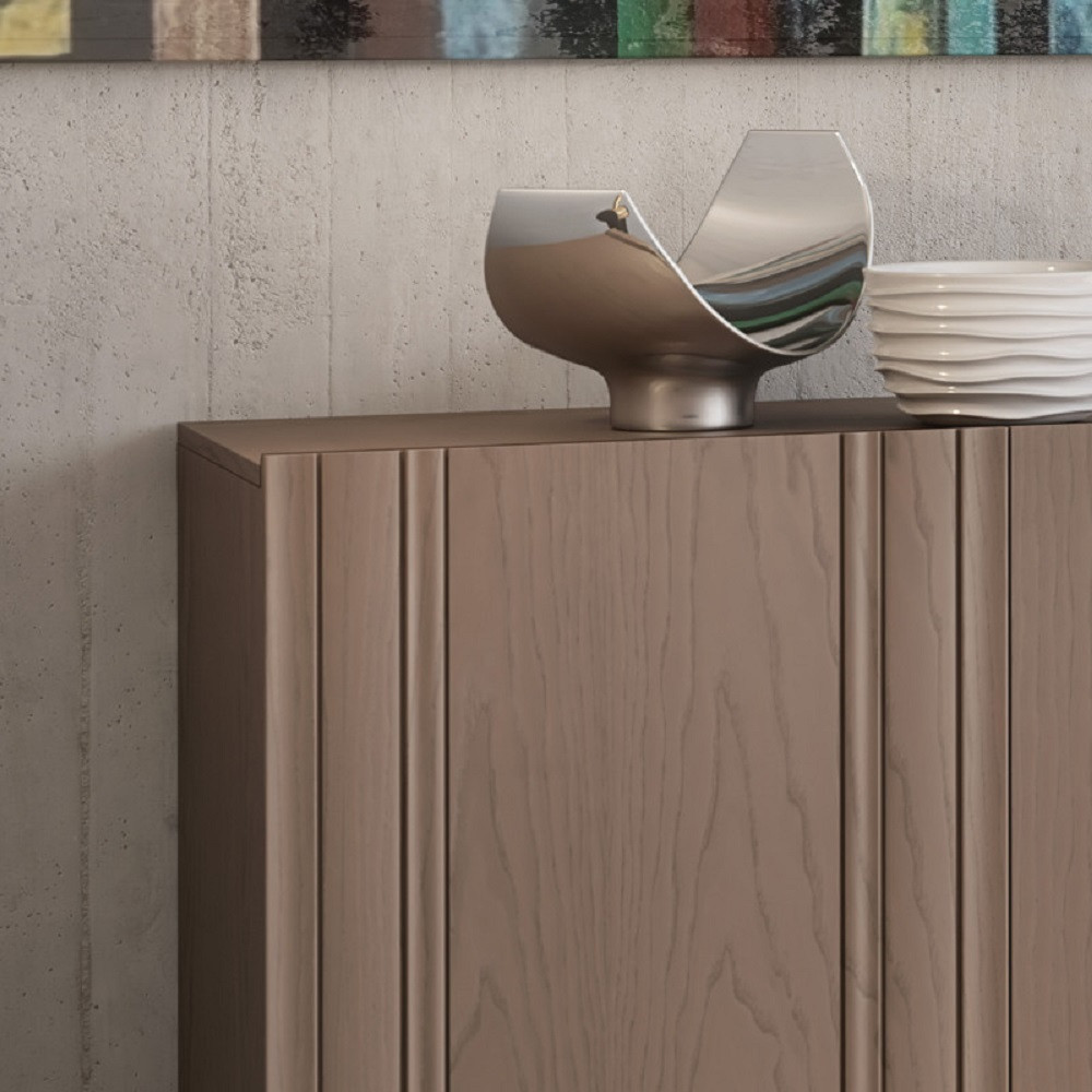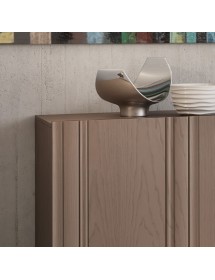 Credenza o madia moderna in legno con 3 ante. Frontale del mobile caratterizzato da inserti in legno massello di frassino. Maniglia ricavata sullo spessore dell’anta.