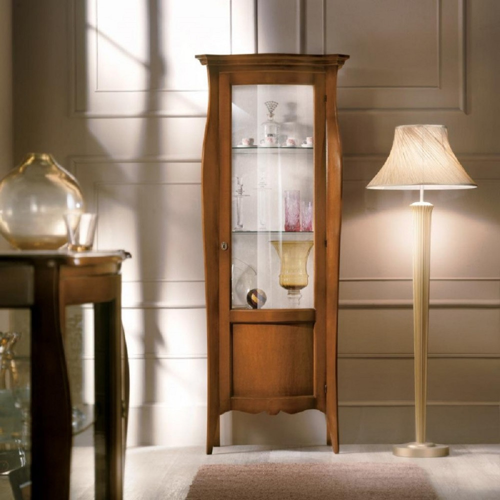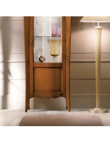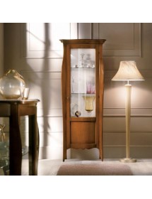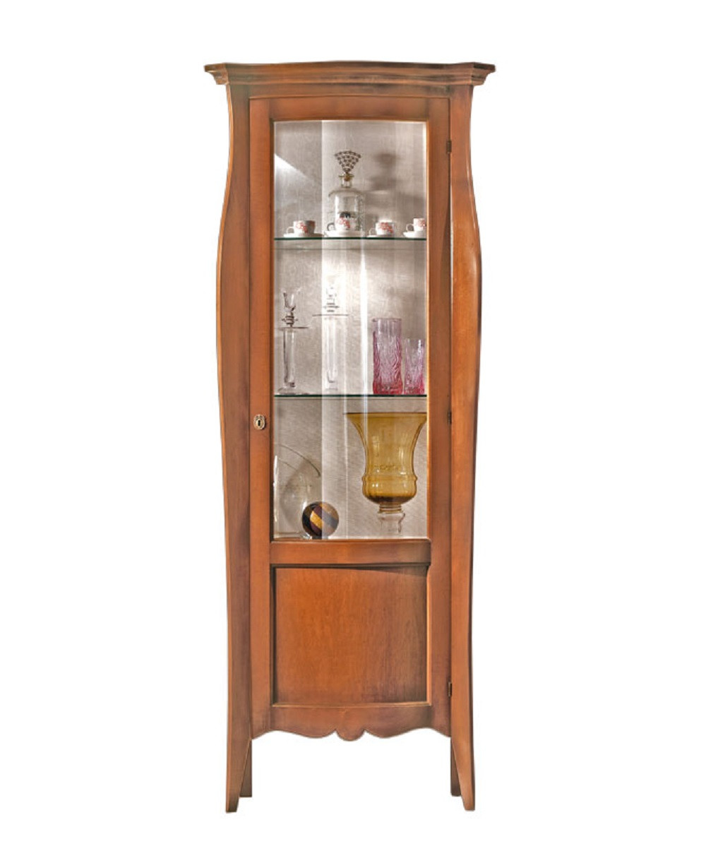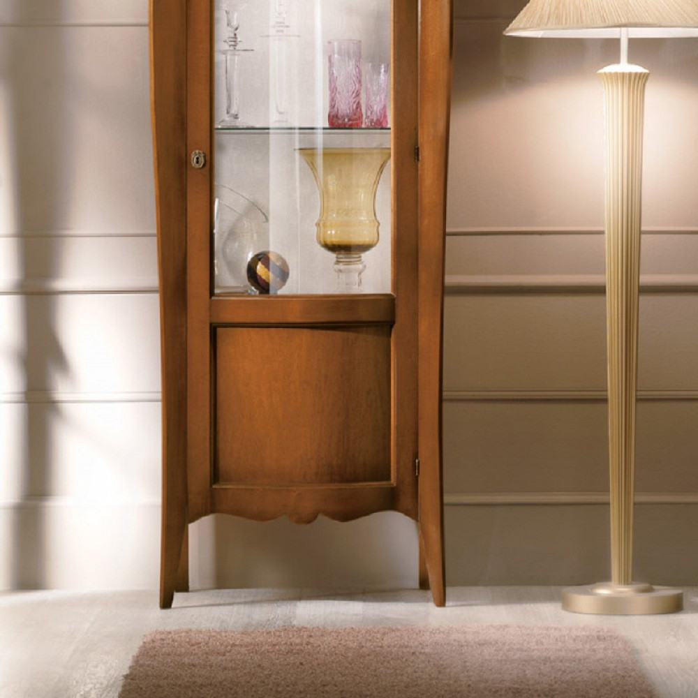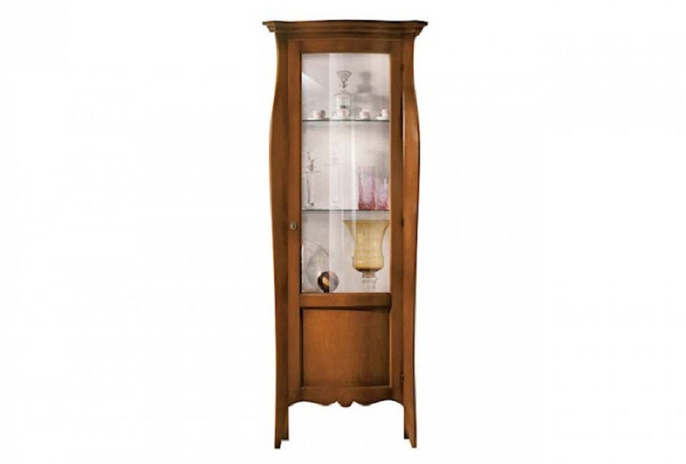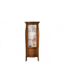 Vetrina sagomata ad un’anta con vetro curvo, fianchi a vetro che permettono una migliore visione degli oggetti esposti. Nella parte a vista sono presenti due ripiani in vetro, nella parte chiusa una tramezza in legno.