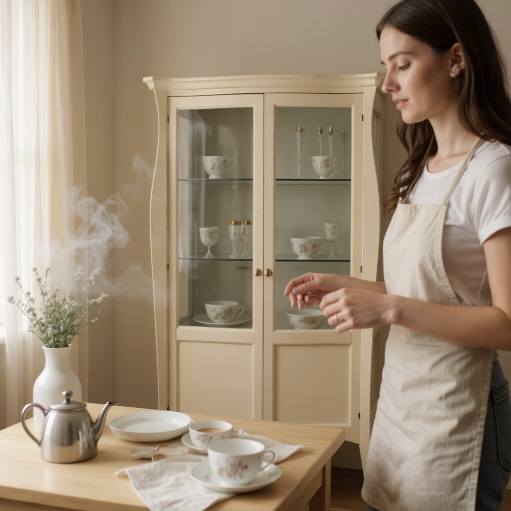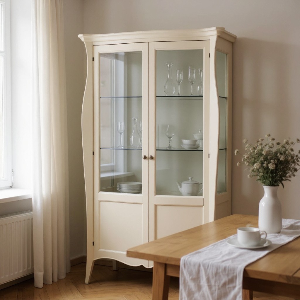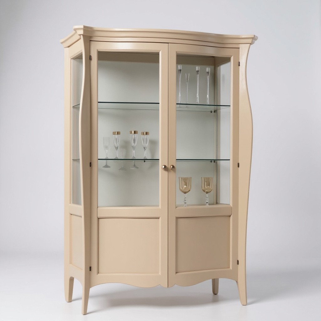 Vetrina in legno con due ante e fianchi a vetro con tre ripiani. Mobile dalle linee morbide e arrotondate per chi desidera esporre oggetti e stoviglie di valore. Vetrina con forte ispirazione dallo stile classico ma con estrema eleganza e pulizia formale tipica del mobile d'altri tempi.