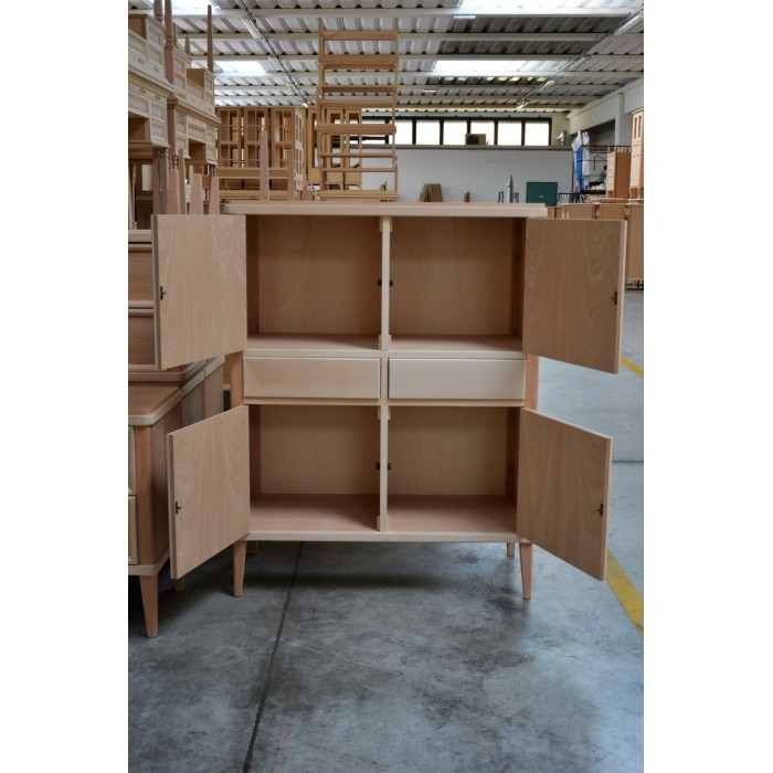Credenza quattro porte, due cassetti interni dal design elegante. Le ante riquadrate contengono all'interno due ripiani , al centro del mobile sono presenti 2 cassetti, base lineare rialzato da piedi a spillo.