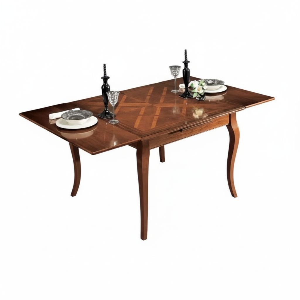 Tavolo costruito in legno massello con gambe sagomate rendendo il mobile elegante e leggero. Dotato di due allunghe da 40 cm allungabile con apertura laterale da entrambi i lati, detta anche 'apertura a tiro', le allunghe sono riposte sotto il piano. Intarsio sul coperchio del piano con un disegno geometrico rendendolo unico nel suo genere. Ideale per il soggiorno o in cucina.
