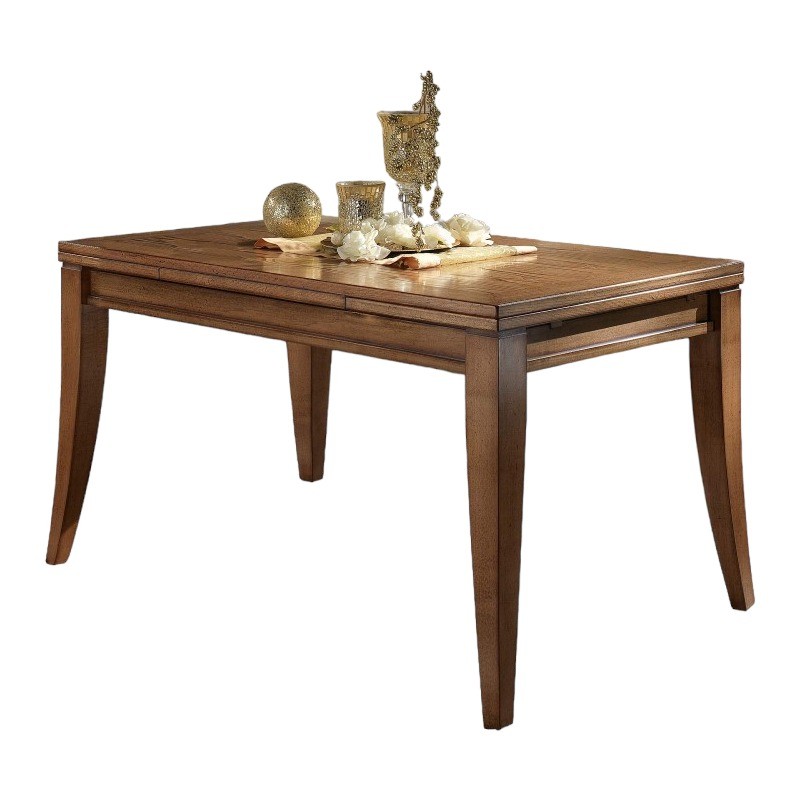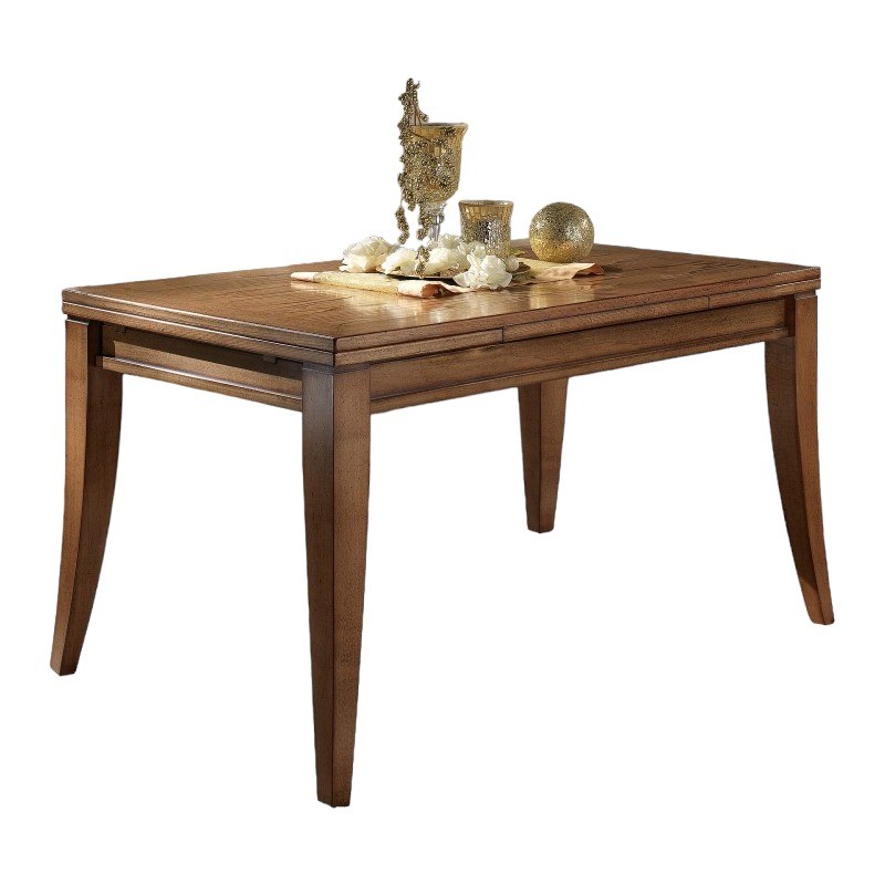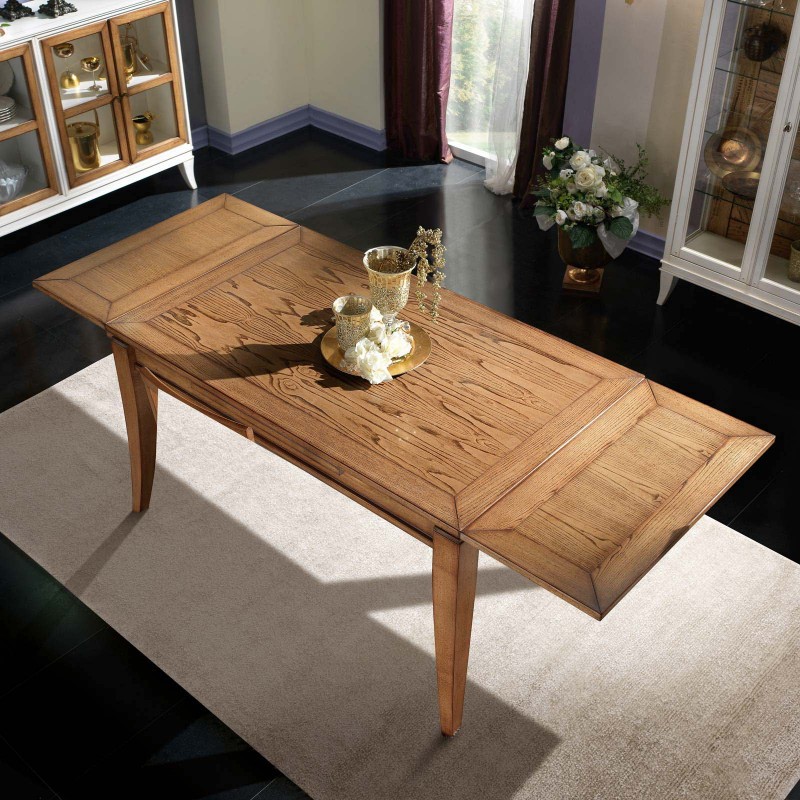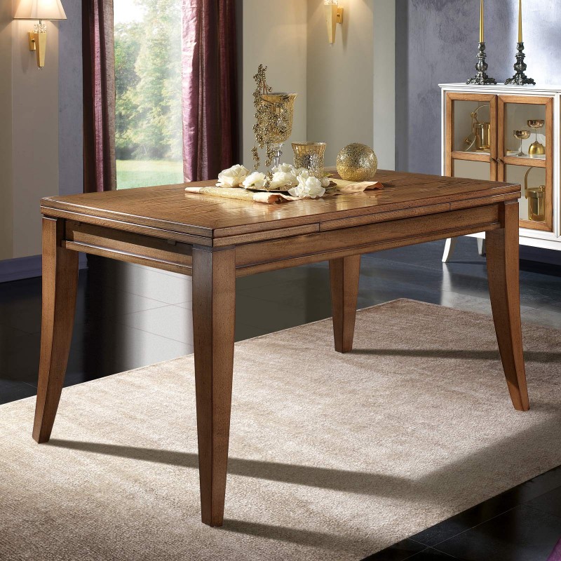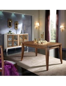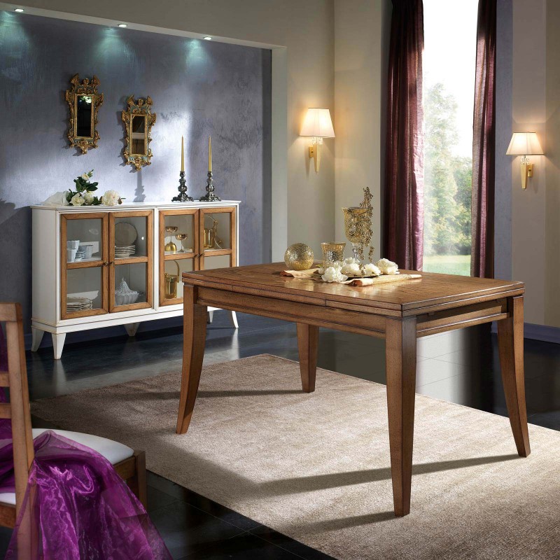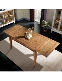 Tavolo costruito in legno massello con gambe a spillo rendendo il mobile solido e allo stesso tempo elegante. Dotato di due allunghe da 40 cm allungabile con apertura laterale da entrambi i lati, detta anche 'apertura a tiro', le allunghe sono riposte sotto il piano. Ideale per il soggiorno o in cucina.