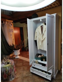 Armadio arte povera con un palo appendiabiti per riporre i tuoi indumenti , sfruttando anche i due cassetti per riporre sciarpe , guanti e accessori. Ante a telaio con cappello dritto che rendono elegante e raffinato sotto tutti i punti di vista questa tipologia di armadio . Ideale da posizionare in camera o all'ingresso della casa