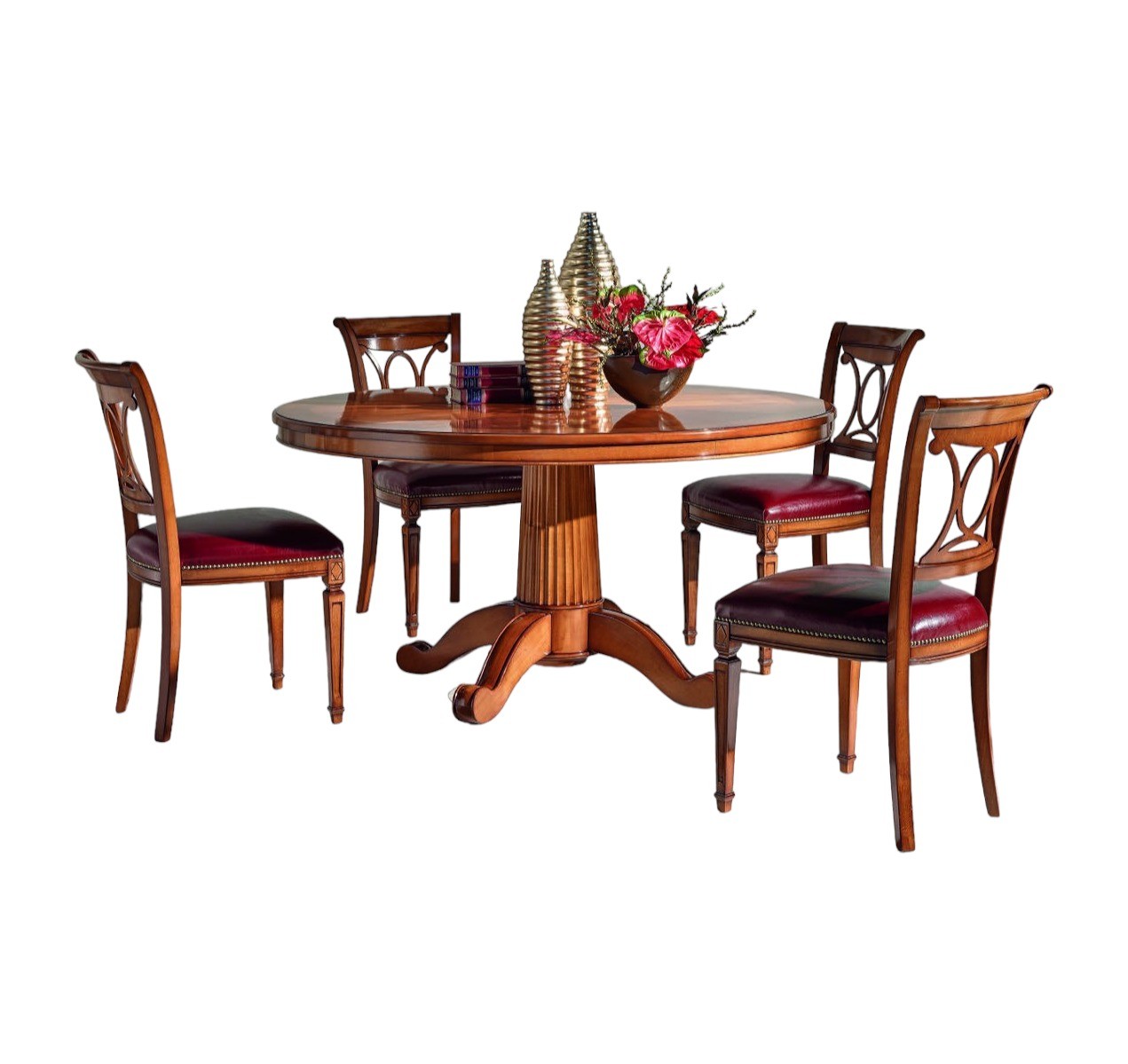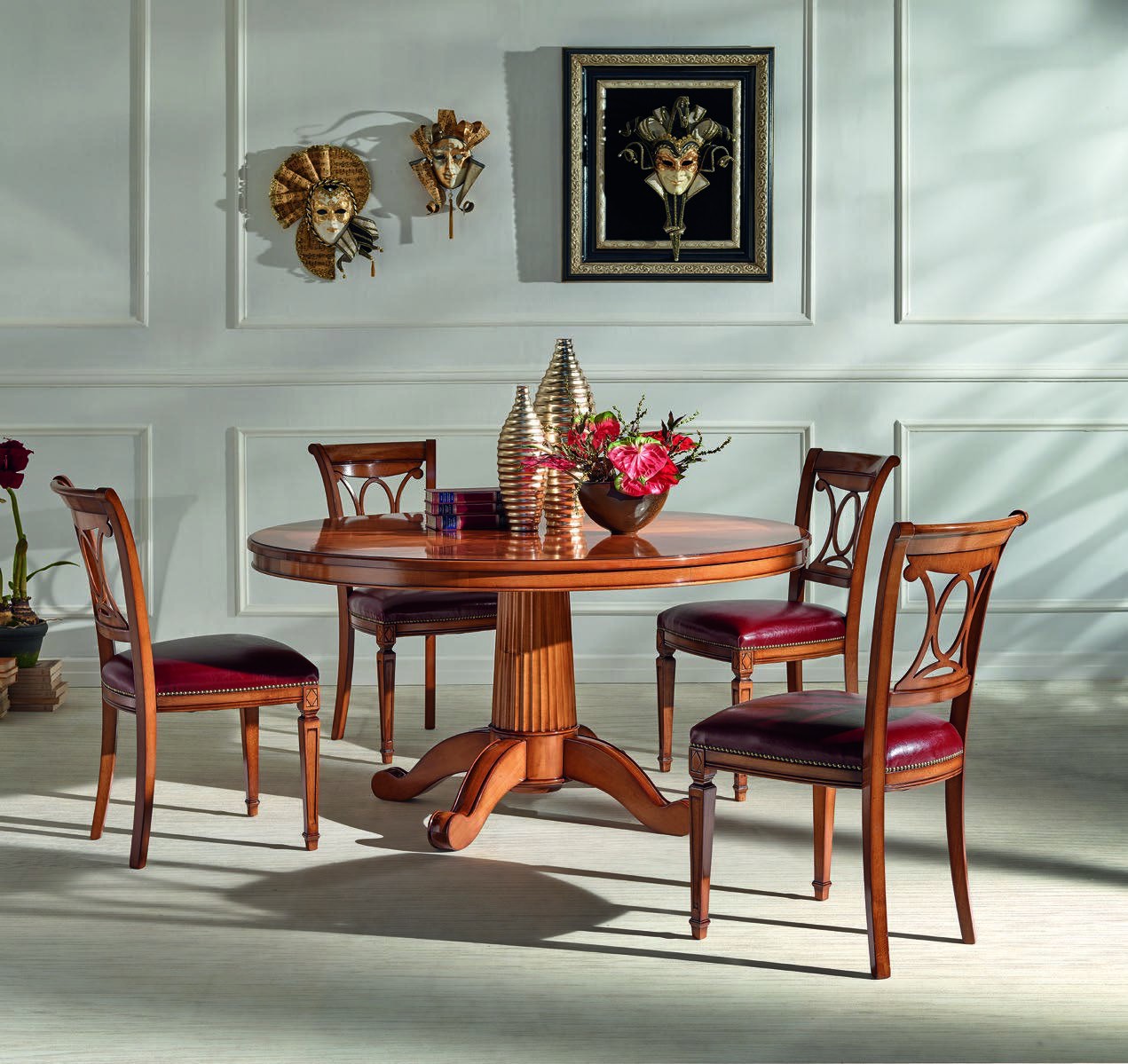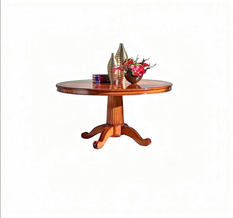 Maestoso tavolo costruito in legno massello, gambone centrale con 4 gambe finemente intagliate rendendo il mobile solido e allo stesso tempo elegante. Piano rotondo fisso con intarsio centrale spina pesce realizzato con varie essenze di legno da mani di esperti artigiani del settore dell'arredamento. Tavolo ideale per non passare inosservati da amici o parenti grazie alle sue dimensioni e al suo design originale.