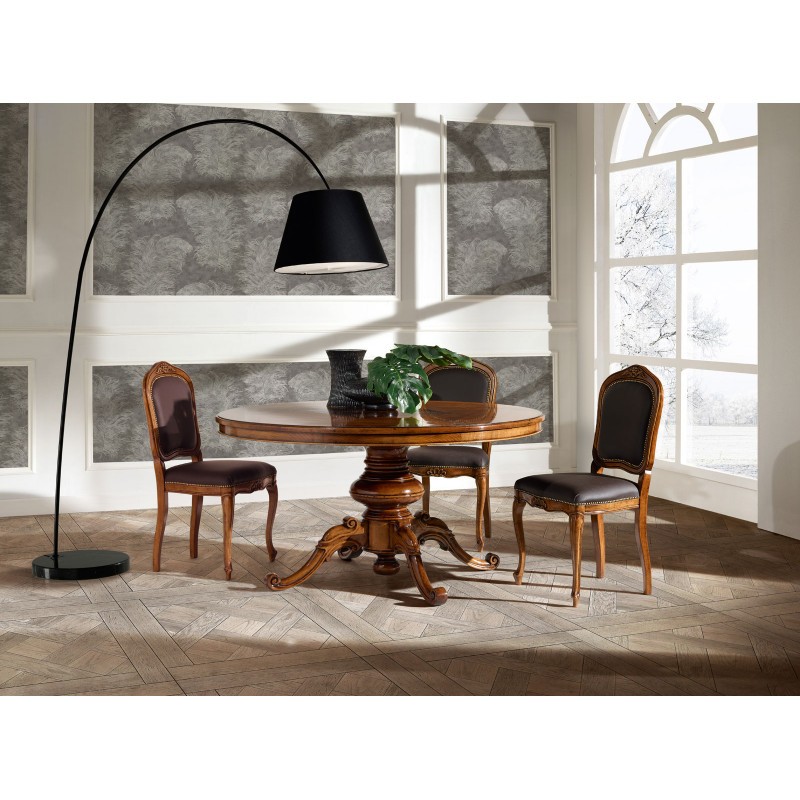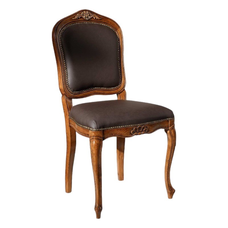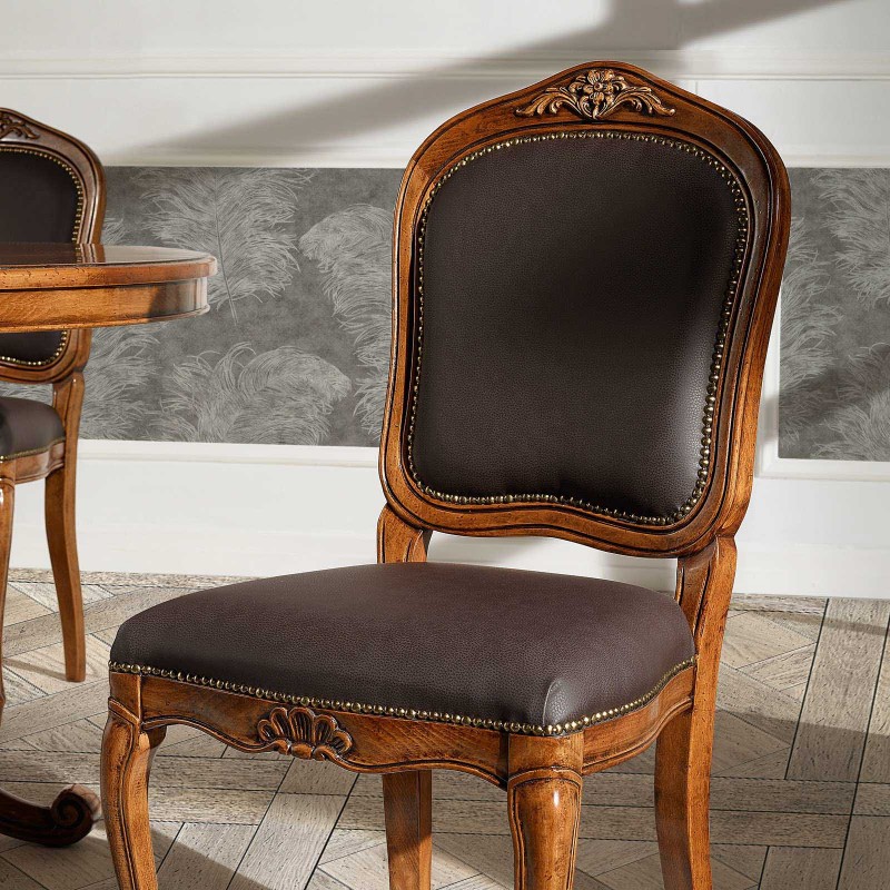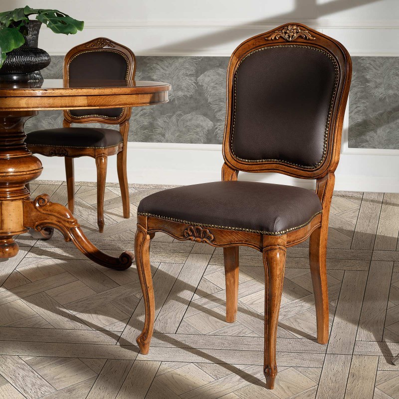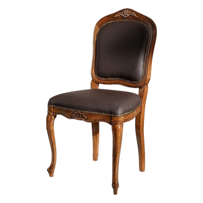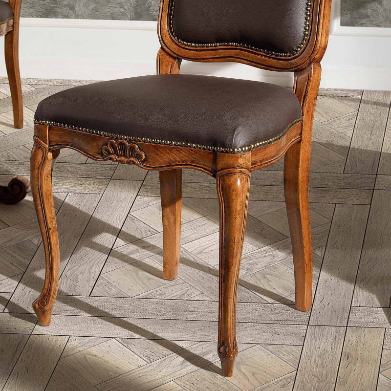 Sedia in legno ideale per chi ama arredare in stile classico la casa, elegante e versatile da posizionare in qualsiasi stanza . Sedia Caratterizzata da intagli realizzati a mano, schienale e seduta sagomata con applicazione di borchie, imbottita per garantire un' esperienza di seduta confortevole e unica. Complemento di arredo che non può mancare nella zona living e che si contraddistingue per la sua originalità.