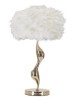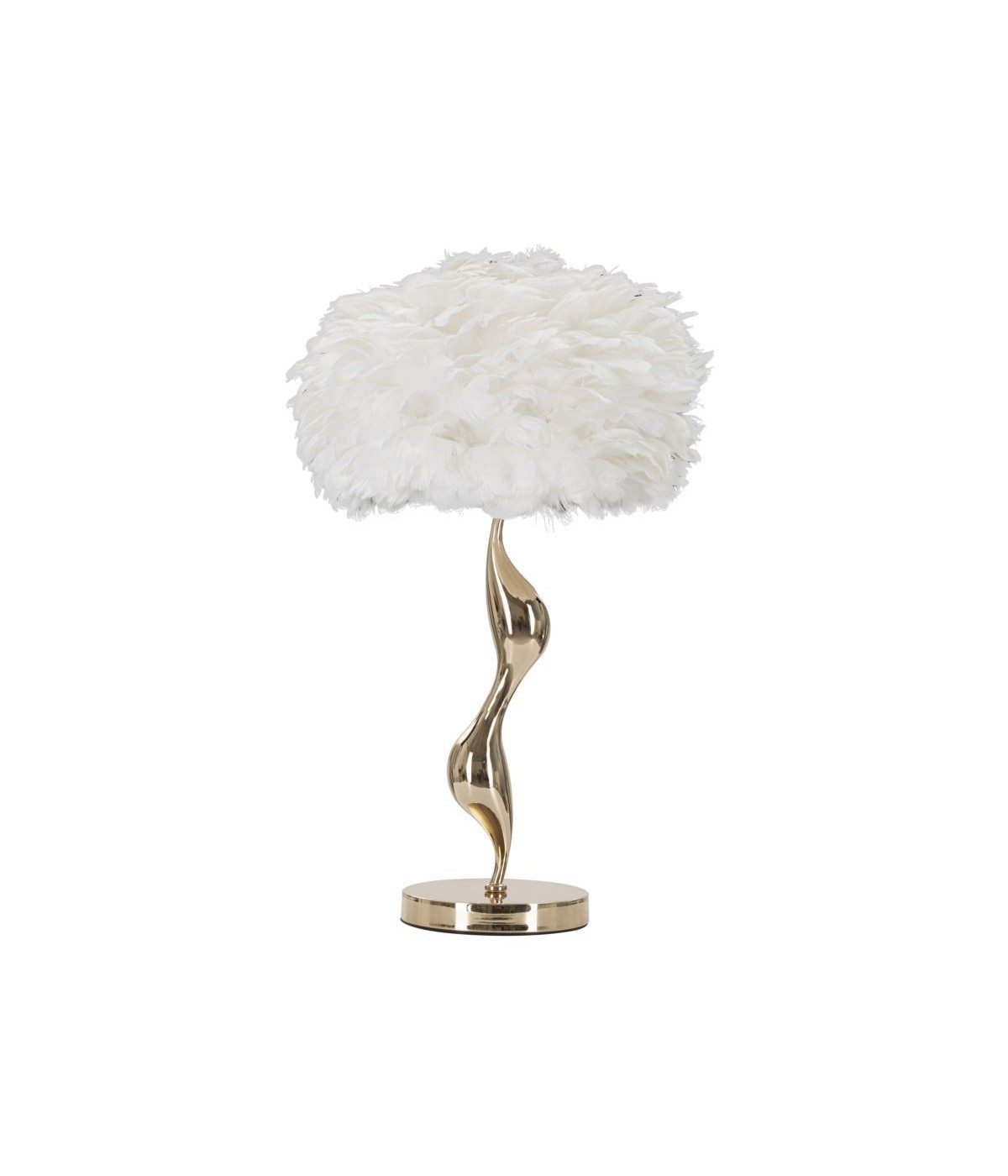 Lampada da tavolo in metallo dorato con elegante decorazione morbida e sinuosa completa di paralume composto da piume.