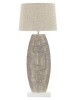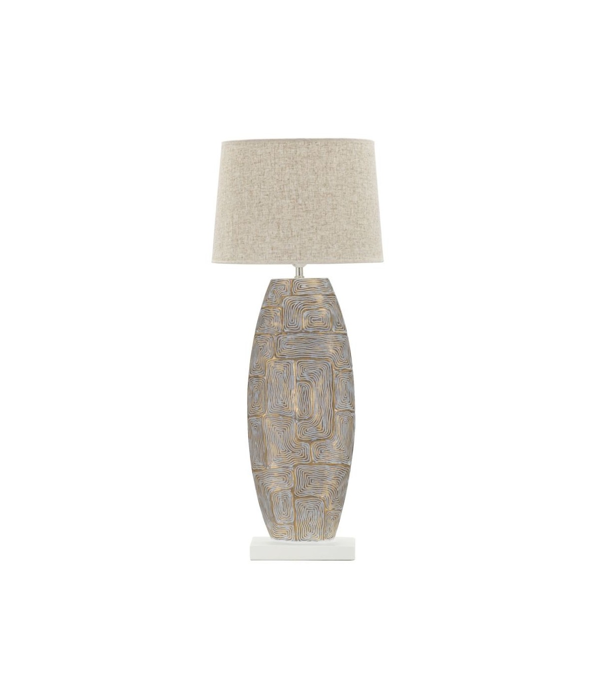 Lampada da tavolo in resina con eleganti decorazioni geometriche in rilievo. Completa di paralume in tessuto beige.