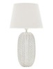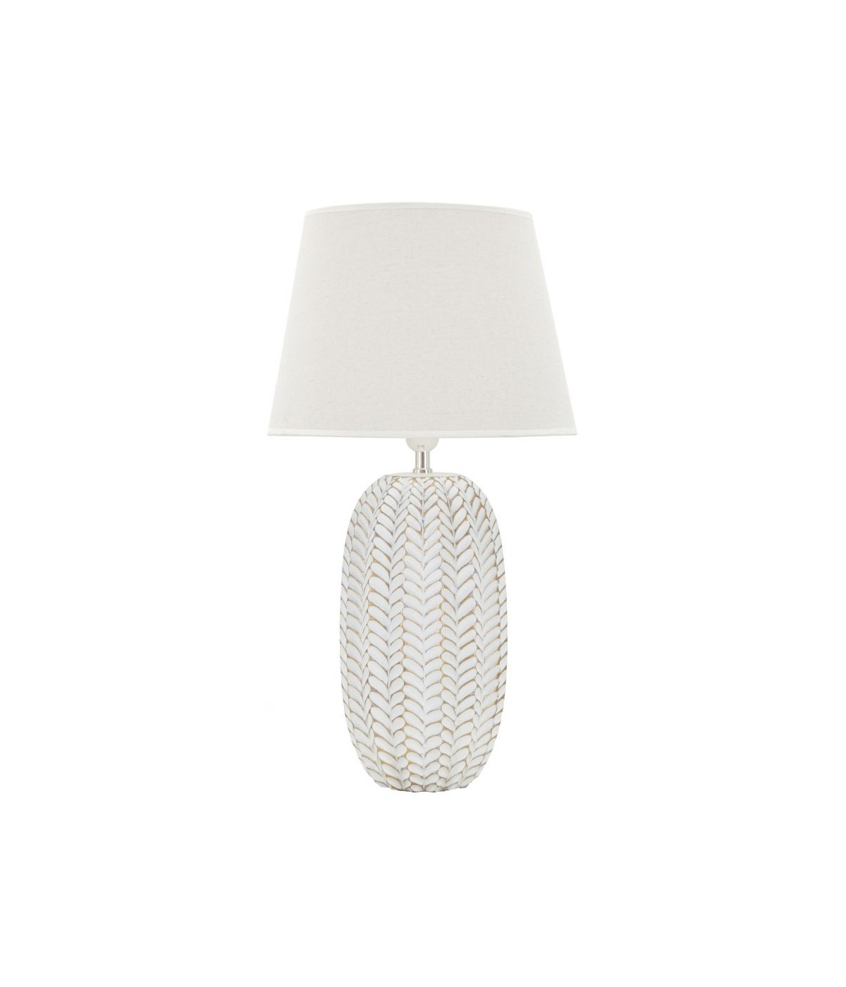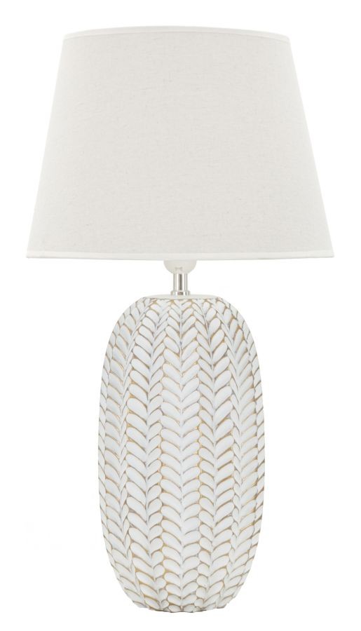 Lampada da tavolo in resina con eleganti decorazioni floreali in rilievo. Completa di paralume in tessuto bianco.