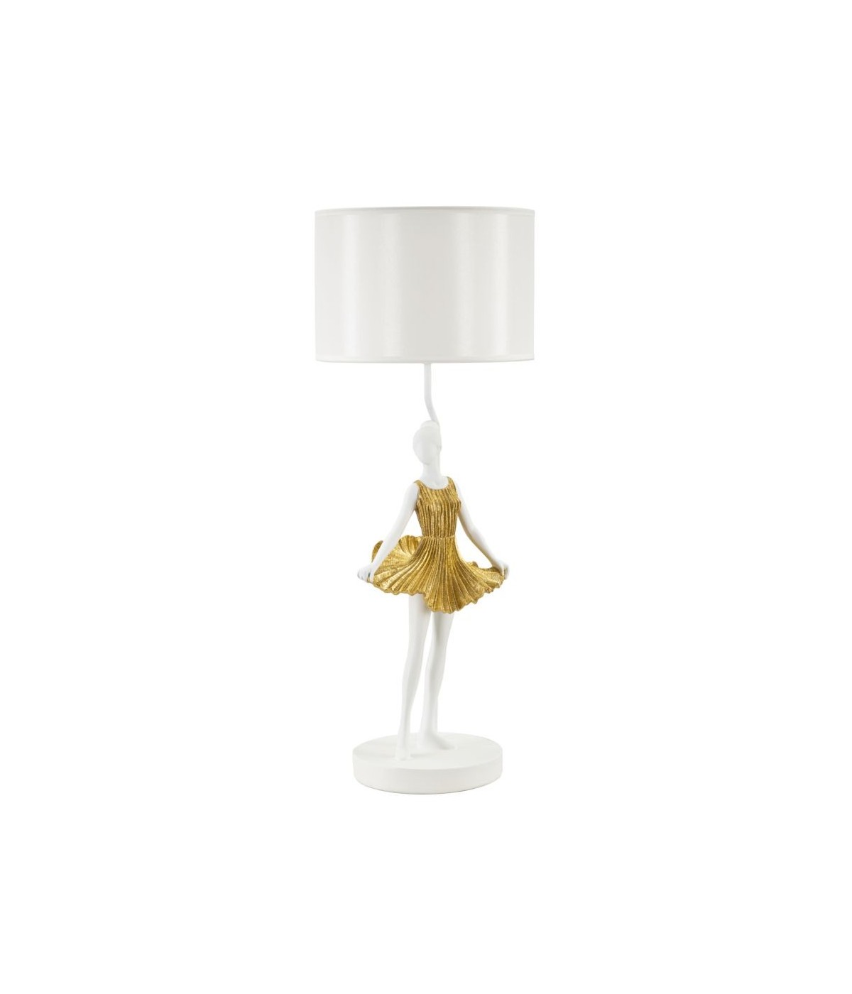 Lampada da tavolo in metallo e resina a forma di ballerina con elegante vestito dorato. Completa di paralume in tessuto bianco.