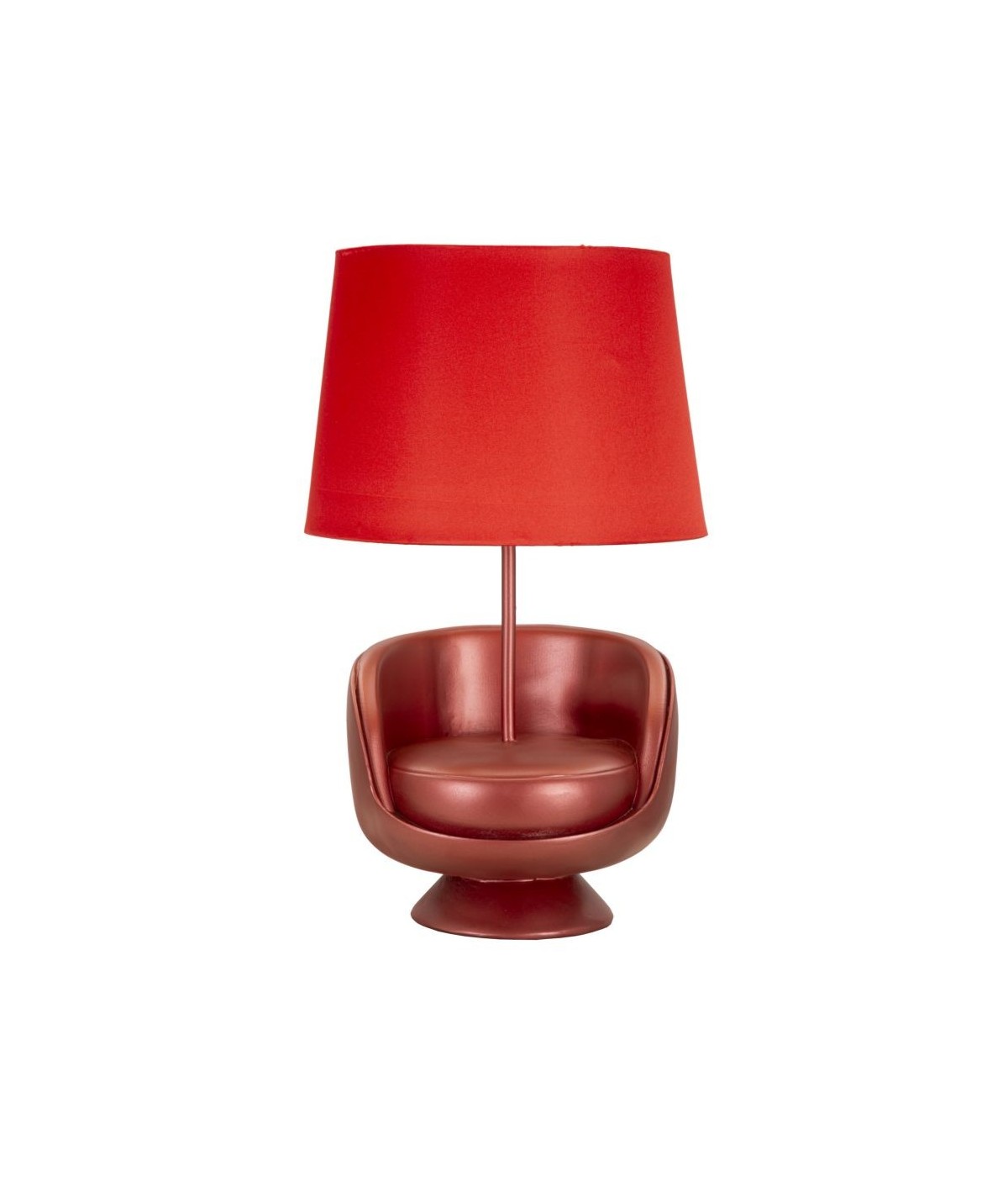Lampada da tavolo in resina rossa a forma di poltrona ispirata agli anni '70. Completa di paralume in tessuto rosso.