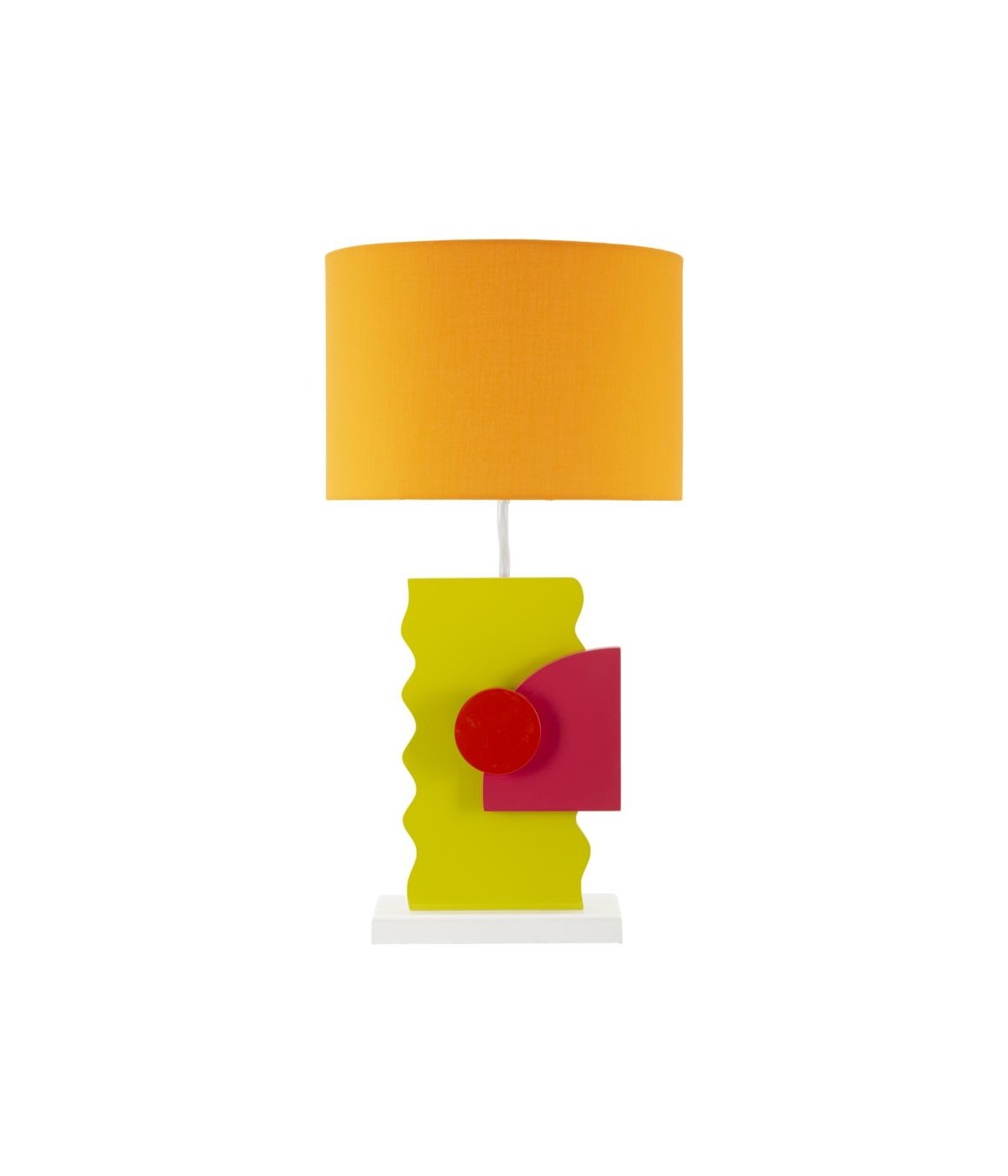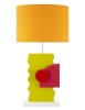 Lampada da tavolo in legno composta da figure che richiamano l'arte futurista. Completa di paralume in tessuto arancio.