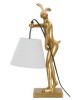 Lampada da tavolo in resina dorata a forma di coniglio che tiene in mano il paralume in tessuto bianco.