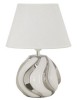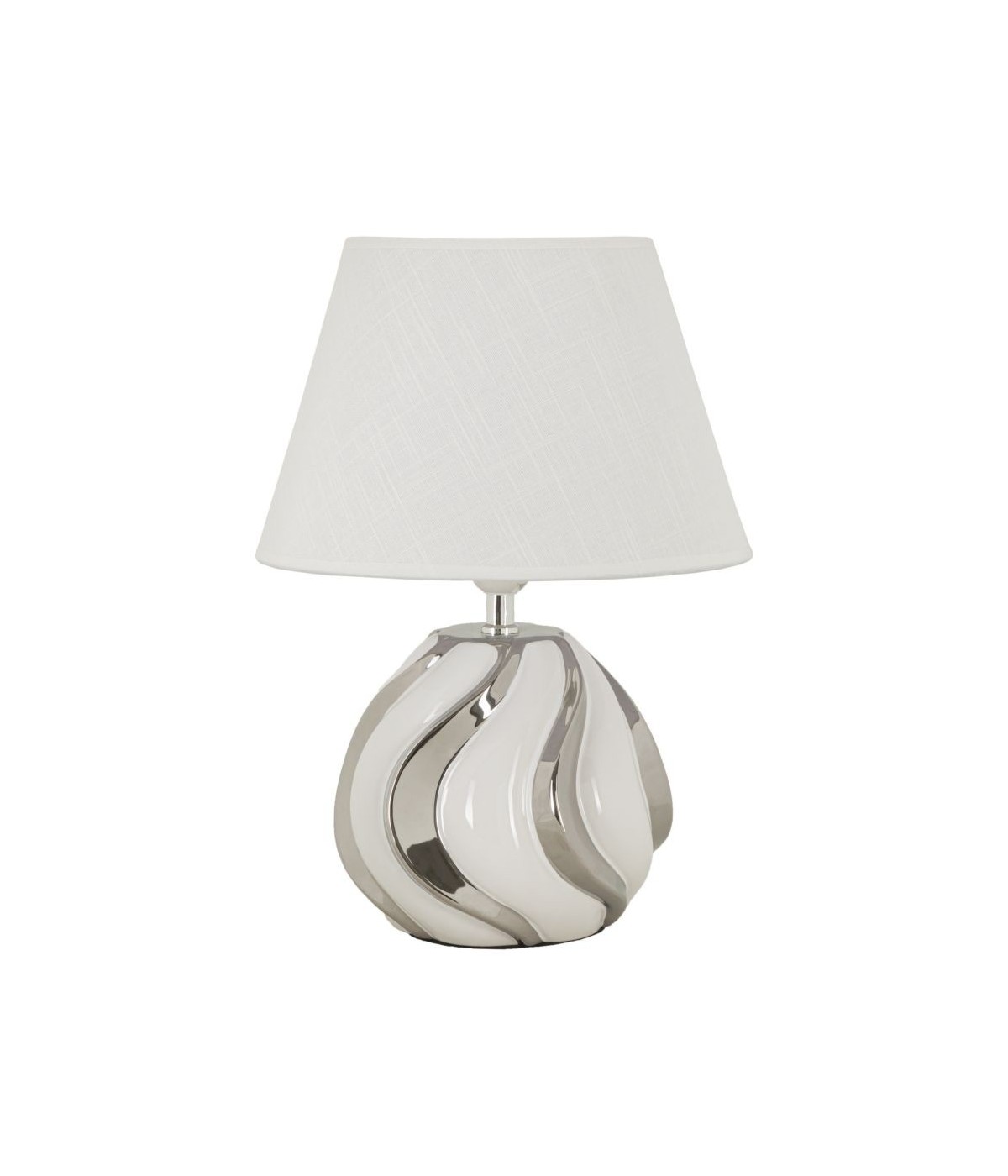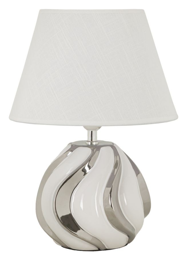 Lampada in ceramica bianca con rifiniture argentate dal design semplice ed elegante. Completa di paralume in tessuto bianco.