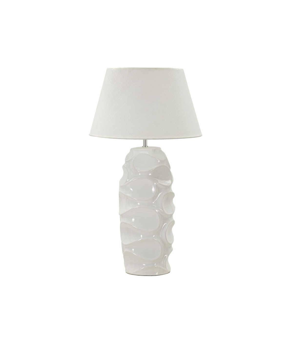 Lampada in ceramica bianca dalle forme morbide e arrotondate. Completa di paralume in tessuto bianco.