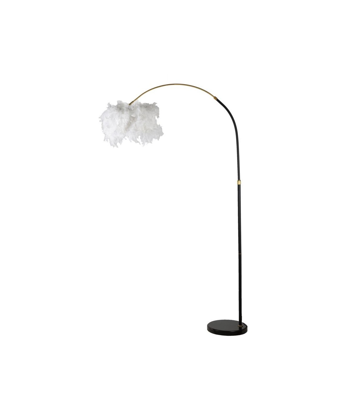 Piantana in metallo nero dal design arcuato e lineare completa di elegante paralume composto da piume sintetiche.