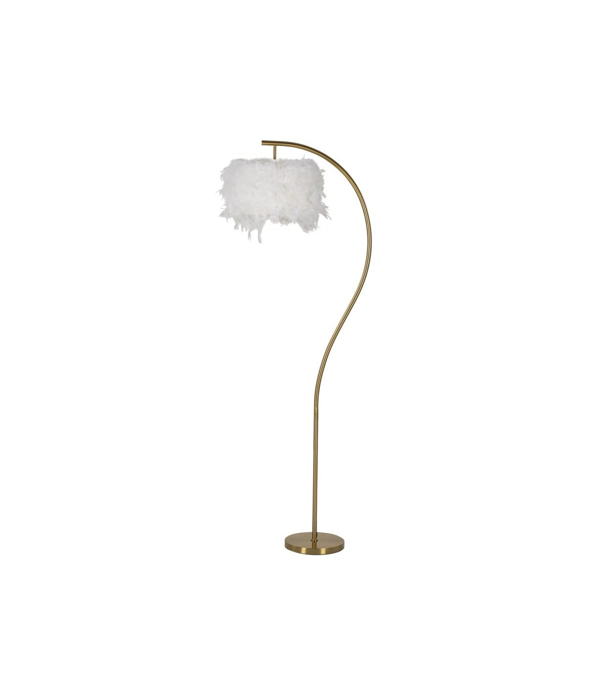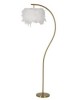 Lampada da tavolo in metallo dorato dal design arcuato e lineare completa di elegante paralume composto da piume sintetiche.