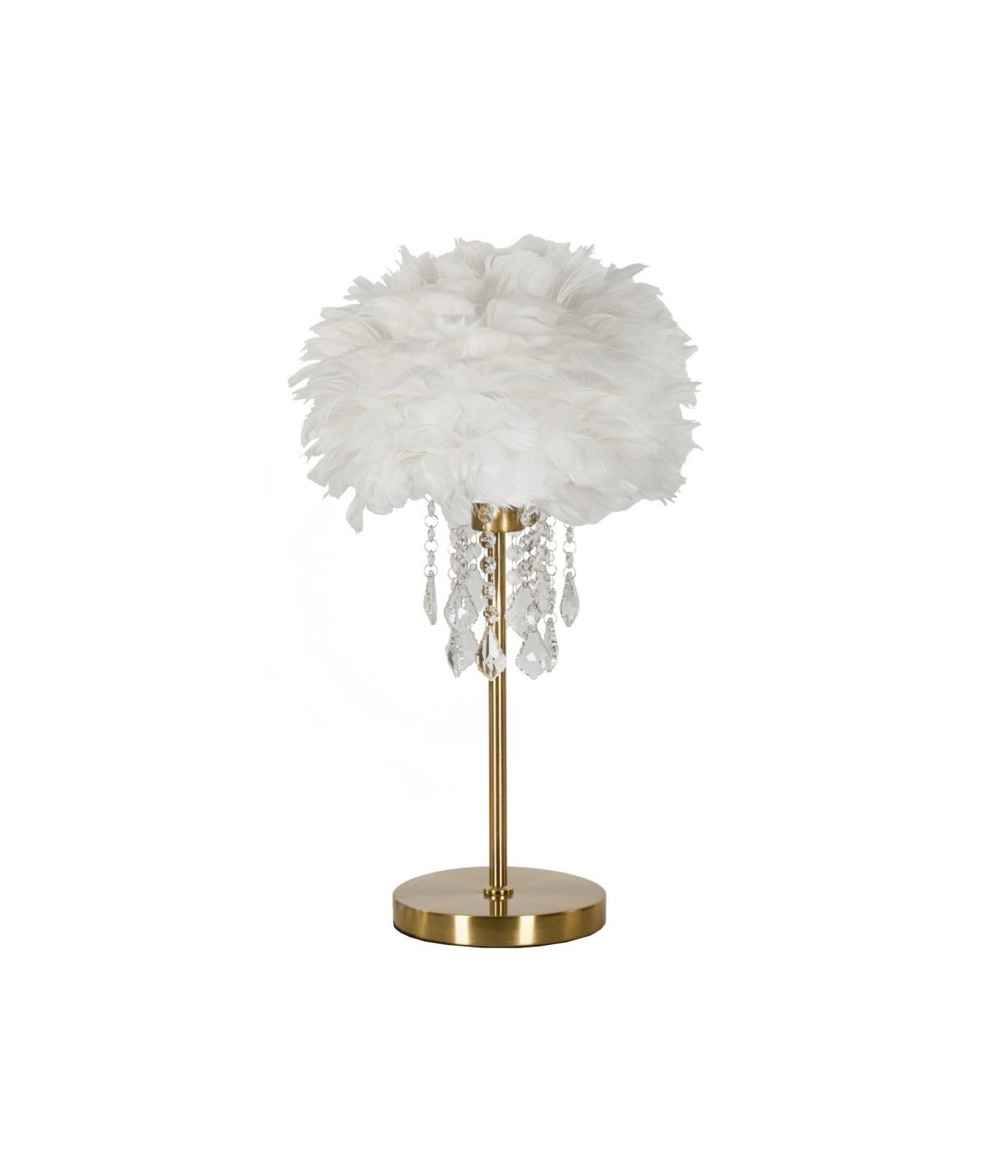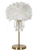 Lampada da tavolo in metallo dorato dal design lineare completa di elegante paralume composto da piume sintetiche e impreziosito da cristalli.