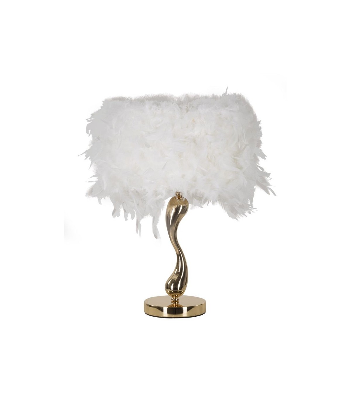 Lampada da tavolo in metallo dorato dal design design morbido e sinuoso, completo di paralume con eleganti piume sintetiche.