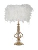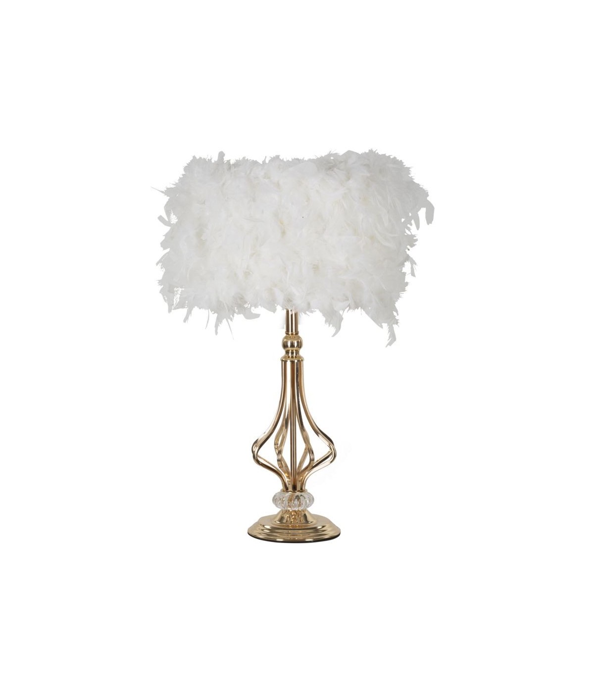Lampada da tavolo in metallo dorato dal design design geometrico, completo di paralume con eleganti piume sintetiche.