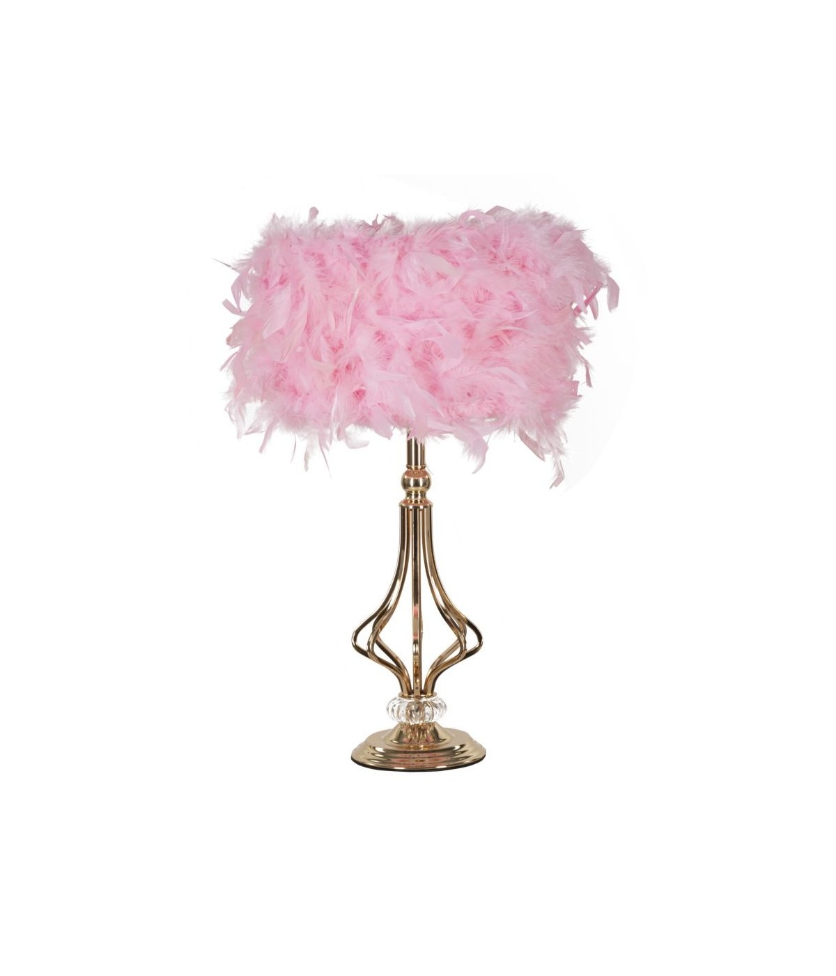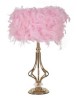 Lampada da tavolo in metallo dorato dal design design geometrico, completo di paralume con eleganti piume sintetiche.