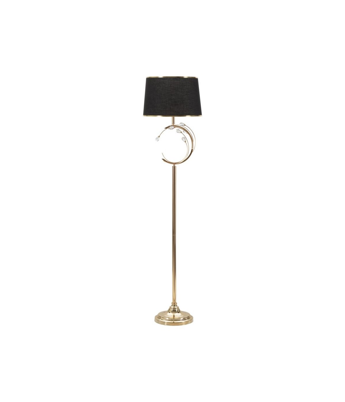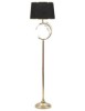 Piantana in metallo dorato con decorazione geometrica con eleganti applicazioni che ricordano dei fiori. Completa di paralume in tessuto nero con finiture dorate.