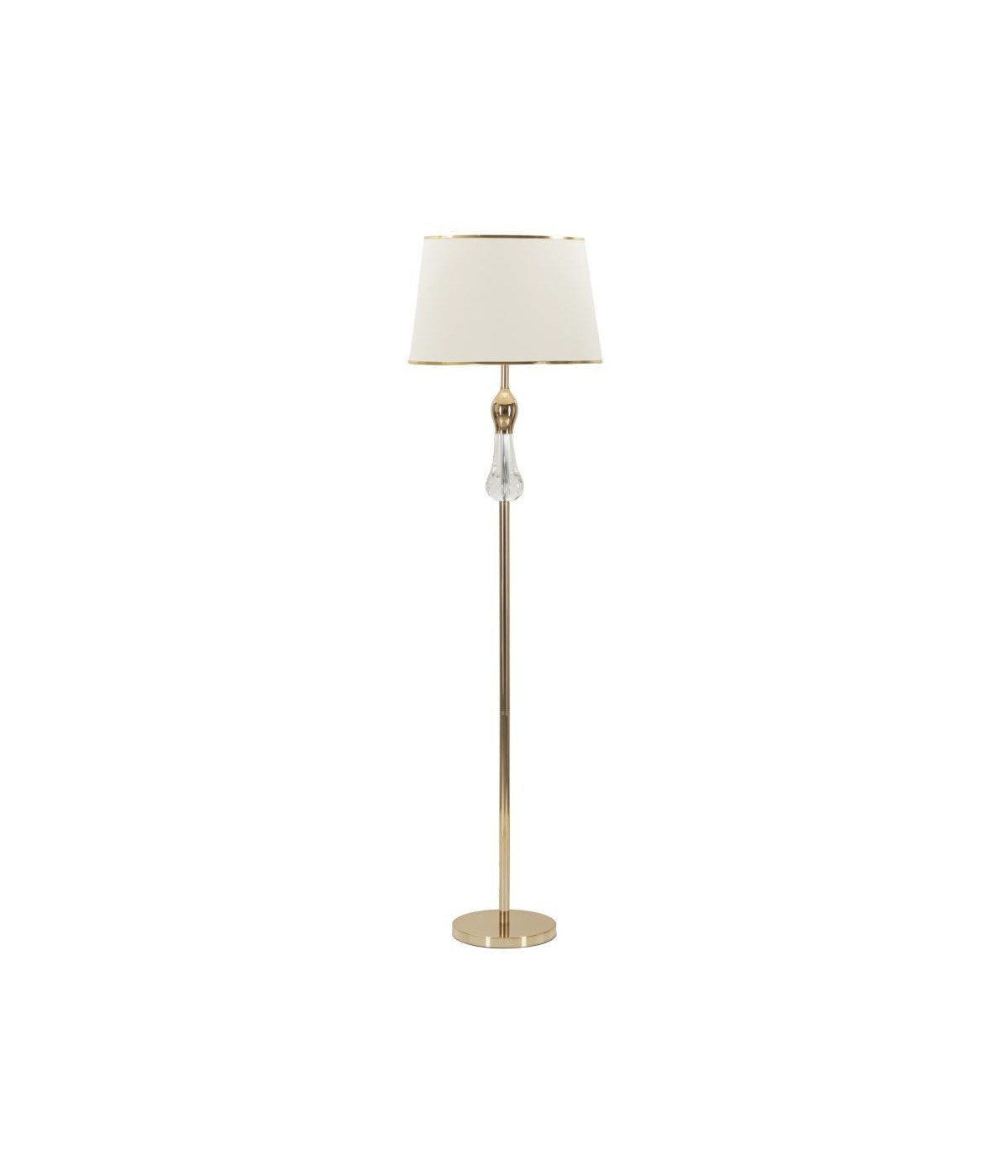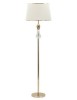 Elegante piantana in metallo dorato con applicazioni trasparenti. Completa di paralume in tessuto beige con finiture dorate.