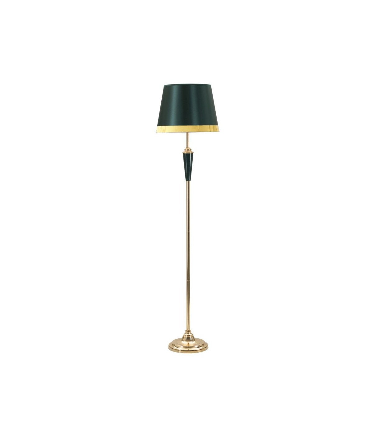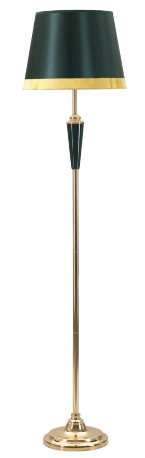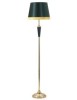 Elegante piantana in metallo dorato con applicazioni verdi. Completa di paralume in tessuto beige con finiture dorate.