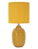 Lampada da comodino con base ocra e decorazioni in rilievo, ideale per un tocco di eleganza e stile moderno in camera da letto.Completa di paralume in tessuto ocra.