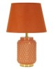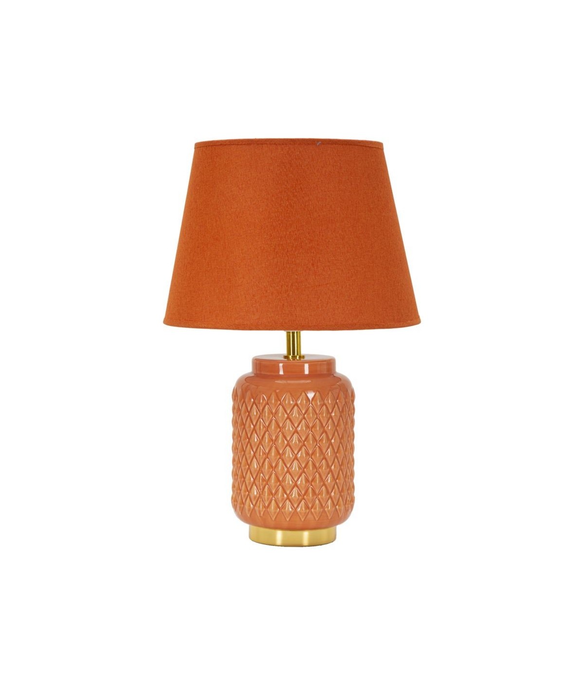 Lampada da comodino con base arancione, decorata con eleganti rombi in rilievo, perfetta per aggiungere un tocco di stile e colore alla tua camera da letto. Completa di paralume in tessuto color arancione.