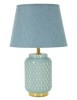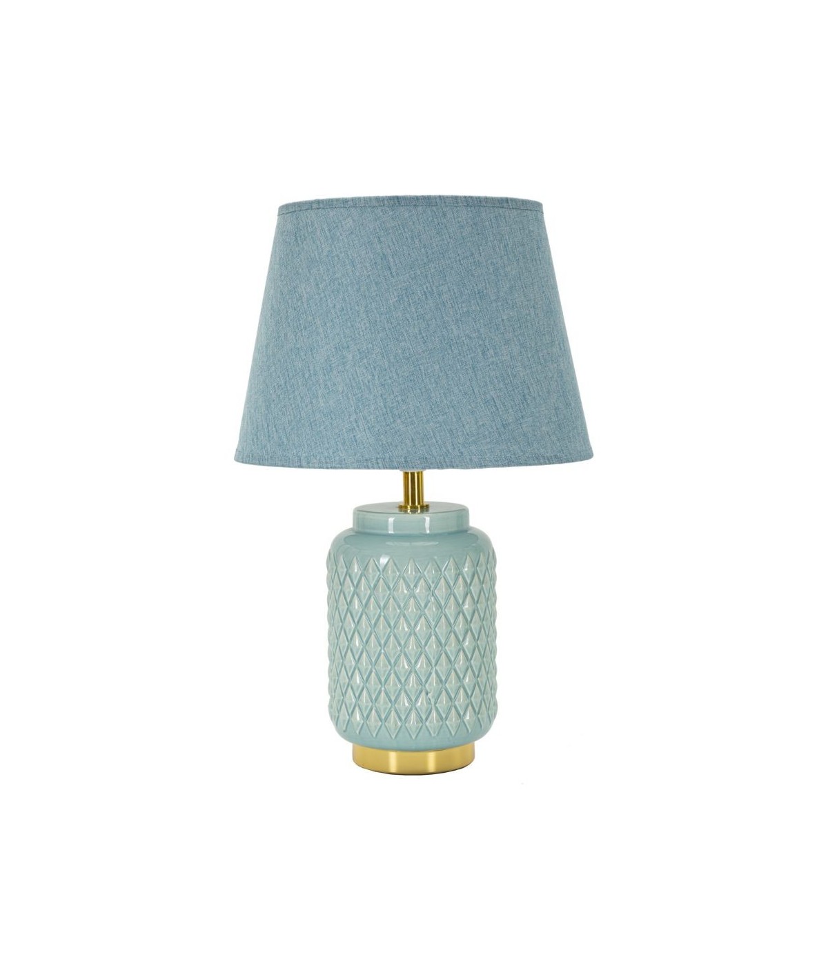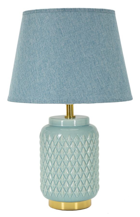 Lampada da comodino con base celeste, decorata con eleganti rombi in rilievo, perfetta per aggiungere un tocco di stile e colore alla tua camera da letto. Completa di paralume in tessuto celeste.
