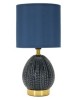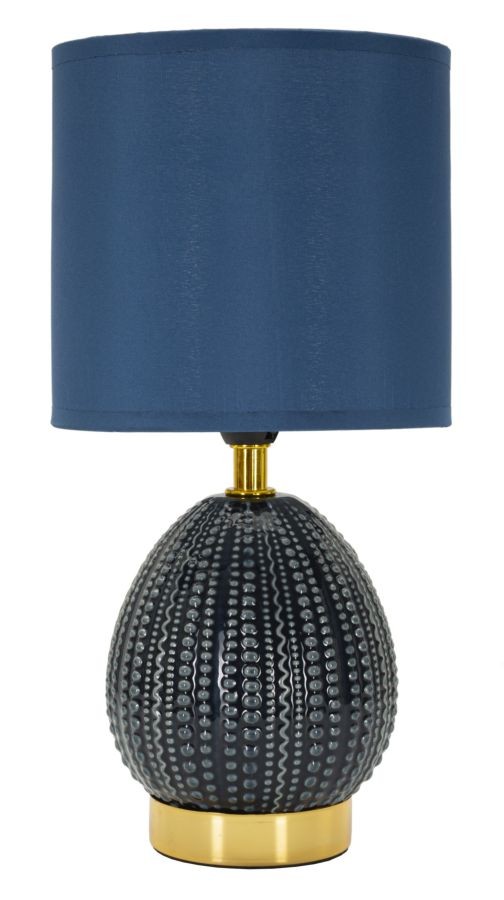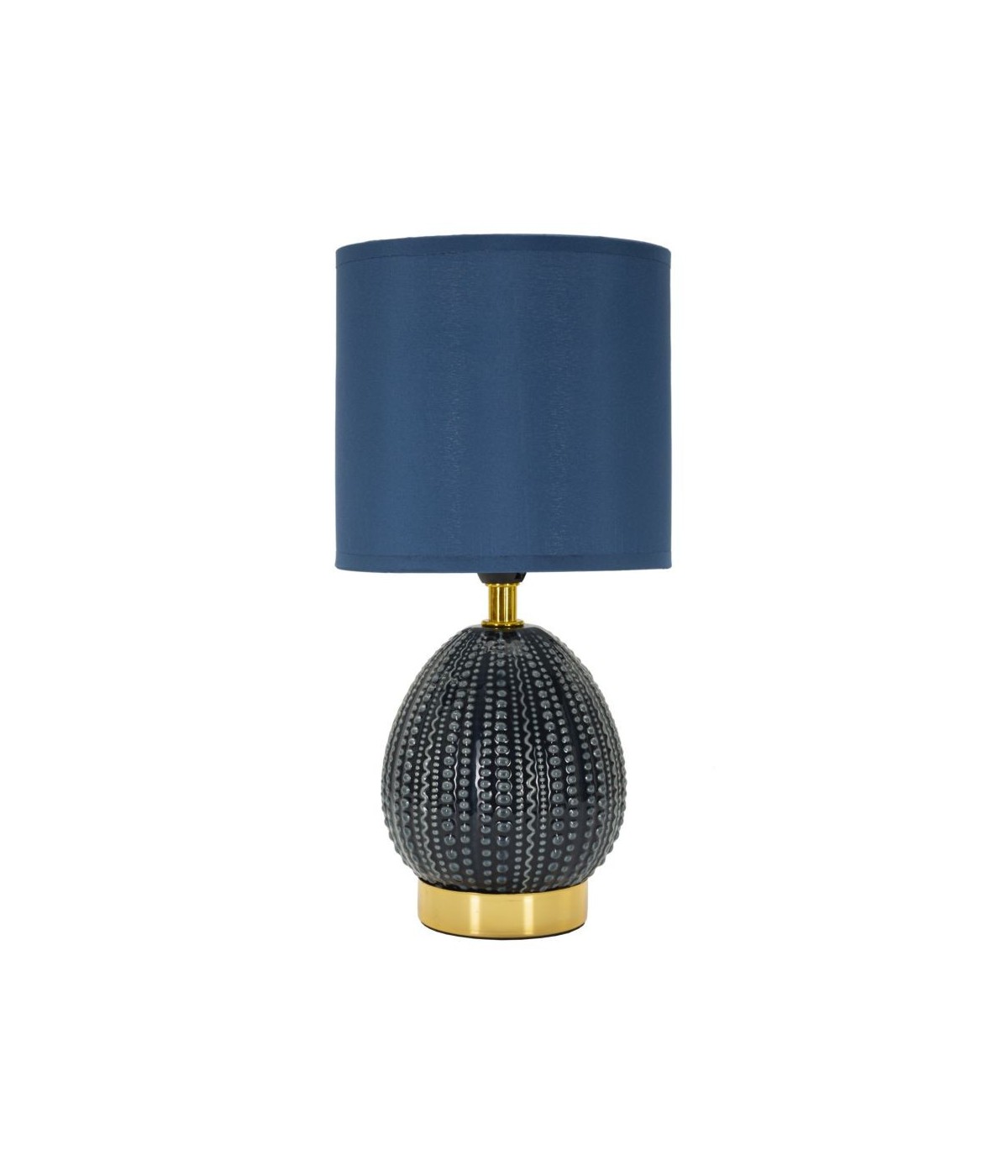 Lampada da comodino elegante con base blu e decorazioni in rilievo irregolari, ideale per aggiungere stile e luminosità alla tua stanza. Completa di paralume in tessuto blu.