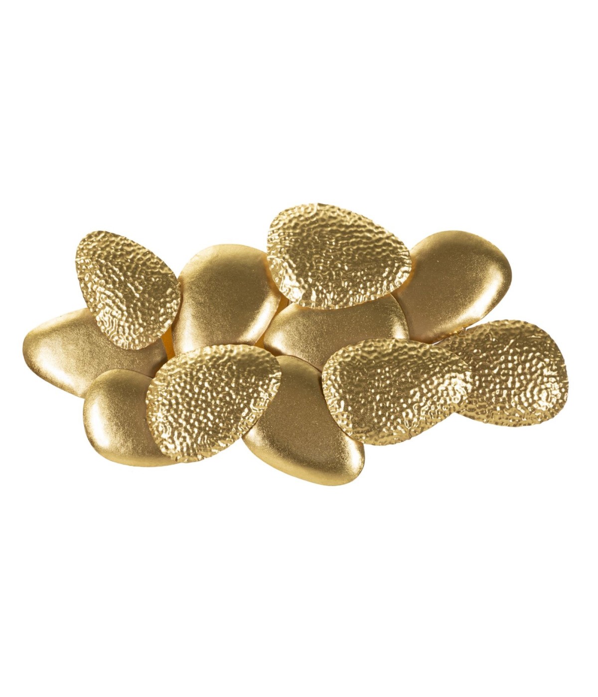 Lampada da parete con 3 punti luce in metallo dorato con lavorazione in foglia oro composto da una serie di pannelli di diverse dimensioni con forme irregolari e arrotondate. Particolare la lavorazione che alterna superfici lisce a superfici con rilievi.