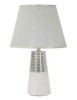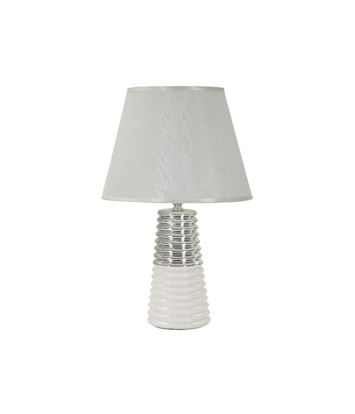 Lampada da tavolo in ceramica bianca e argentata elegantemente decorata con cerchi concentrici. Completa di paralume in tessuto argentato.