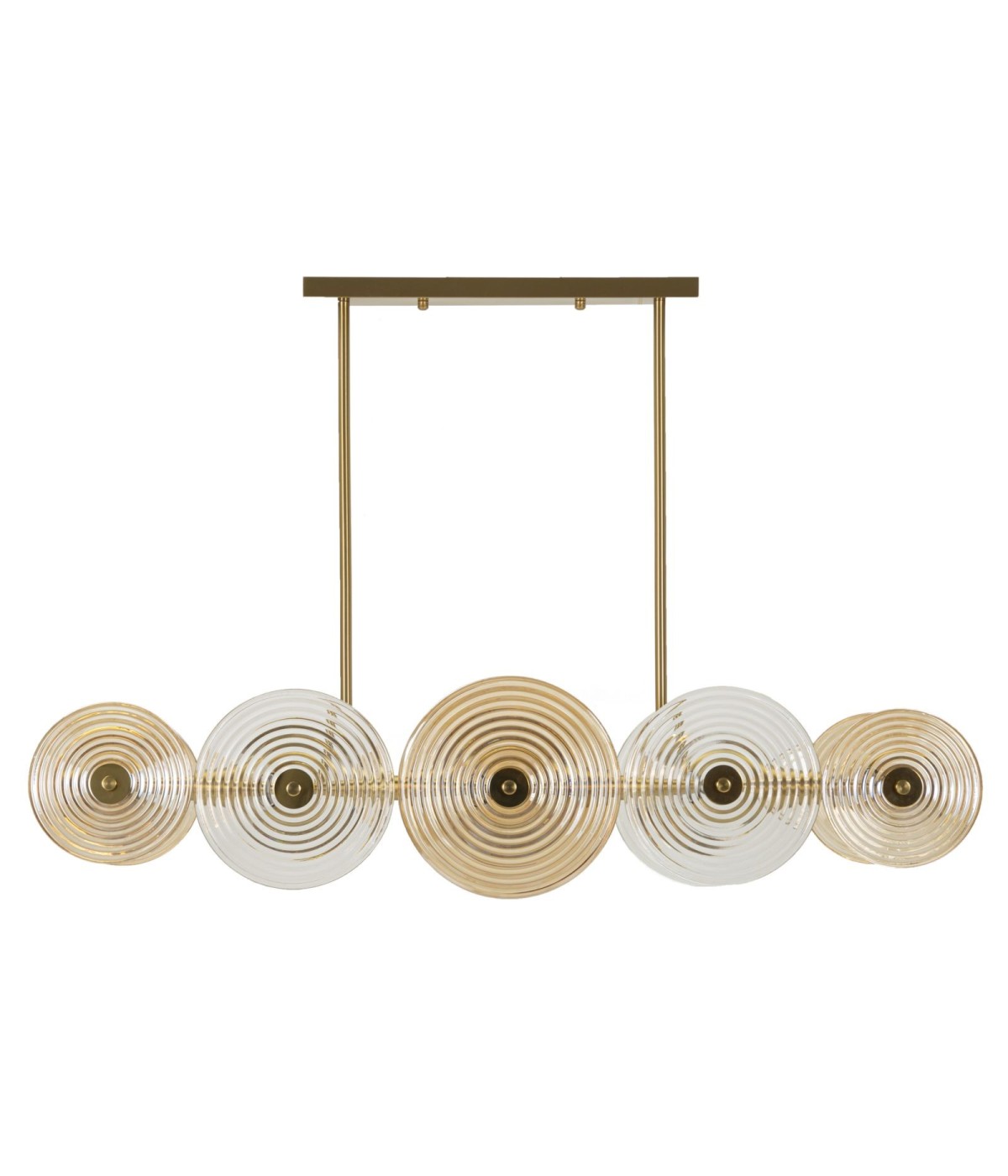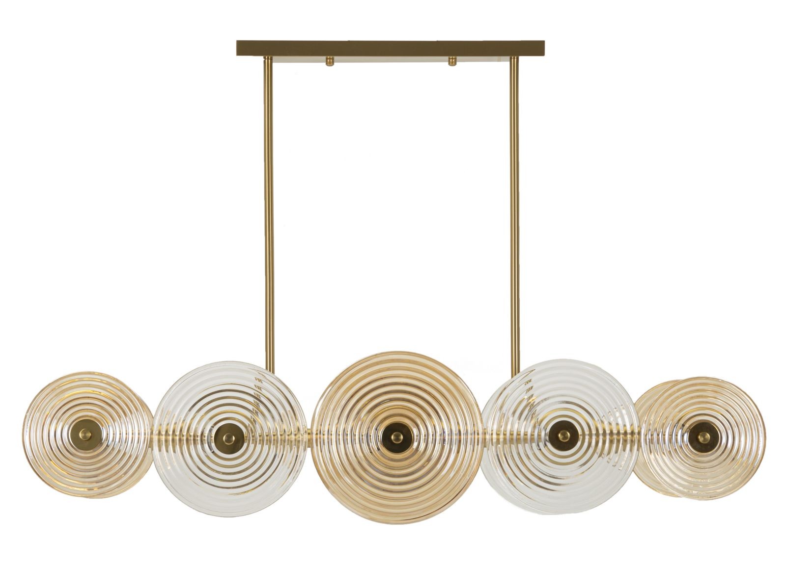 Lampadario in metallo dorato con 7 punti luce dalle linee semplici e geometriche con paralumi rotondi in vetro finemente decorati con cerchi concentrici.