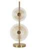 Lampada da tavolo con 2 punti luce in metallo dorato dalle linee semplici ed essenziali, impreziosita da eleganti paralumi in vetro con decorazioni in rilievo.