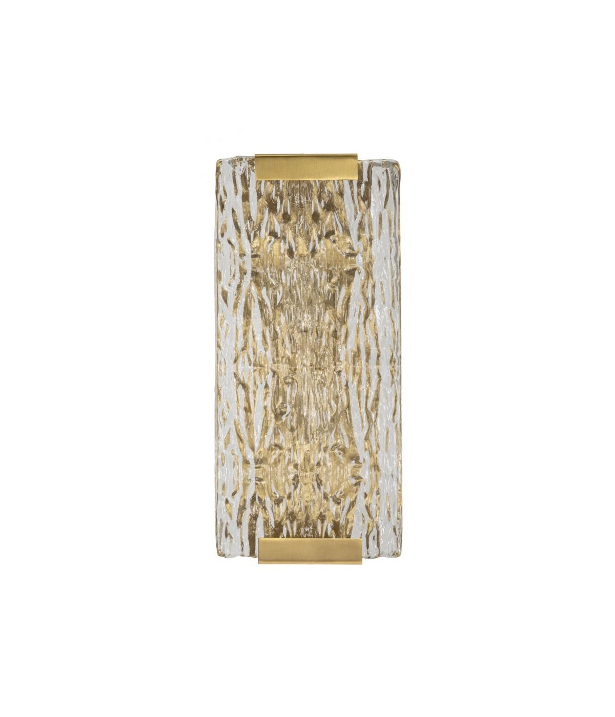 Lampada rettangolare da parete con 2 punti luce in metallo dorato e vetro con particolare lavorazione in rilievo.