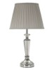Elegante lampada da tavolo in metallo argentato e vetro. Completa di paralume in tessuto grigio con finiture grigio scuro.