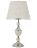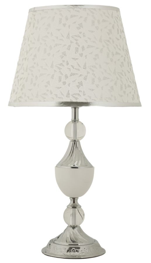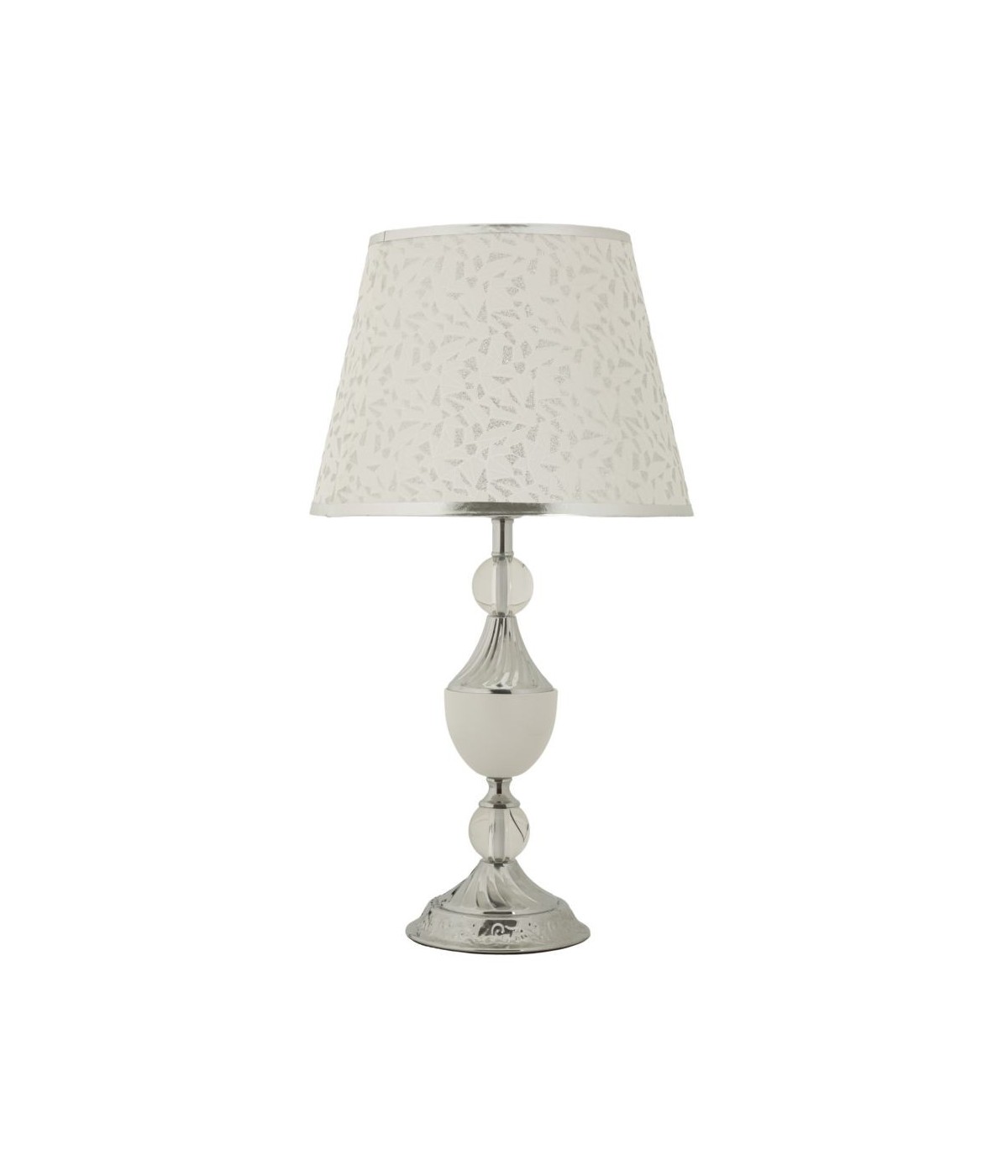 La versione da tavolo della Kody, compatta e decorativa, aggiunge un tocco di grazia classica su comodini e console con la sua finitura lucida e il paralume ricamato.