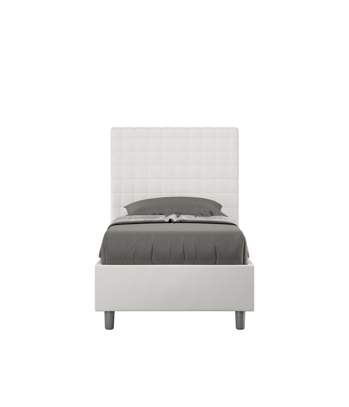 Letto singolo 90x210 Sunny con testata e giroletto imbottiti, rivestimento in similpelle, particolarmente versatile e facilmente abbinabile a qualsiasi stile di arredamento. Il letto singolo 90x210 Sunny è caratterizzato da uno stile moderno ed elegante, evidenziato dalla testiera trapuntata rivestita in similpelle. La presenza del materiale in similpelle, oltre a donare alla stanza un'atmosfera accogliente ed invitante, offre la comodità di una pulizia facile e veloce, grazie all'utilizzo di un semplice panno in microfibra. Letto fornito con rete a doghe, predisposto per materasso da 90x210 cm - Materasso non incluso Rivestimento letto non sfoderabile. Made in Italy Ingombro letto: L.105 P.220 H.122 cm Altezza piedini: 12 cm Altezza giroletto: 27 cm Altezza rete da terra: 39 cm