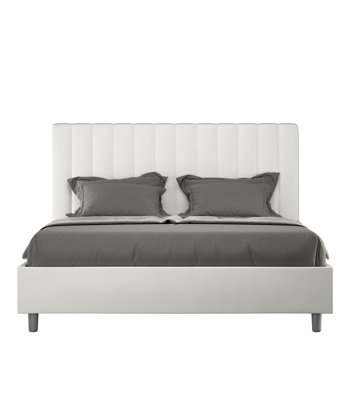 Letto queen size 150x190 Agueda con testata e giroletto imbottiti, rivestimento in similpelle, particolarmente versatile e facilmente abbinabile a qualsiasi stile di arredamento.