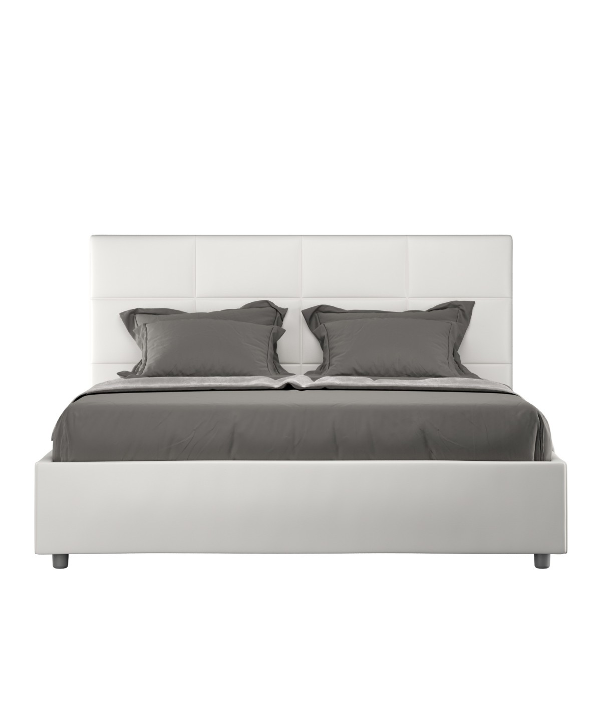 Letto queen size 150x210 Mika con testata e giroletto imbottiti, rivestimento in similpelle, particolarmente versatile e facilmente abbinabile a qualsiasi stile di arredamento.