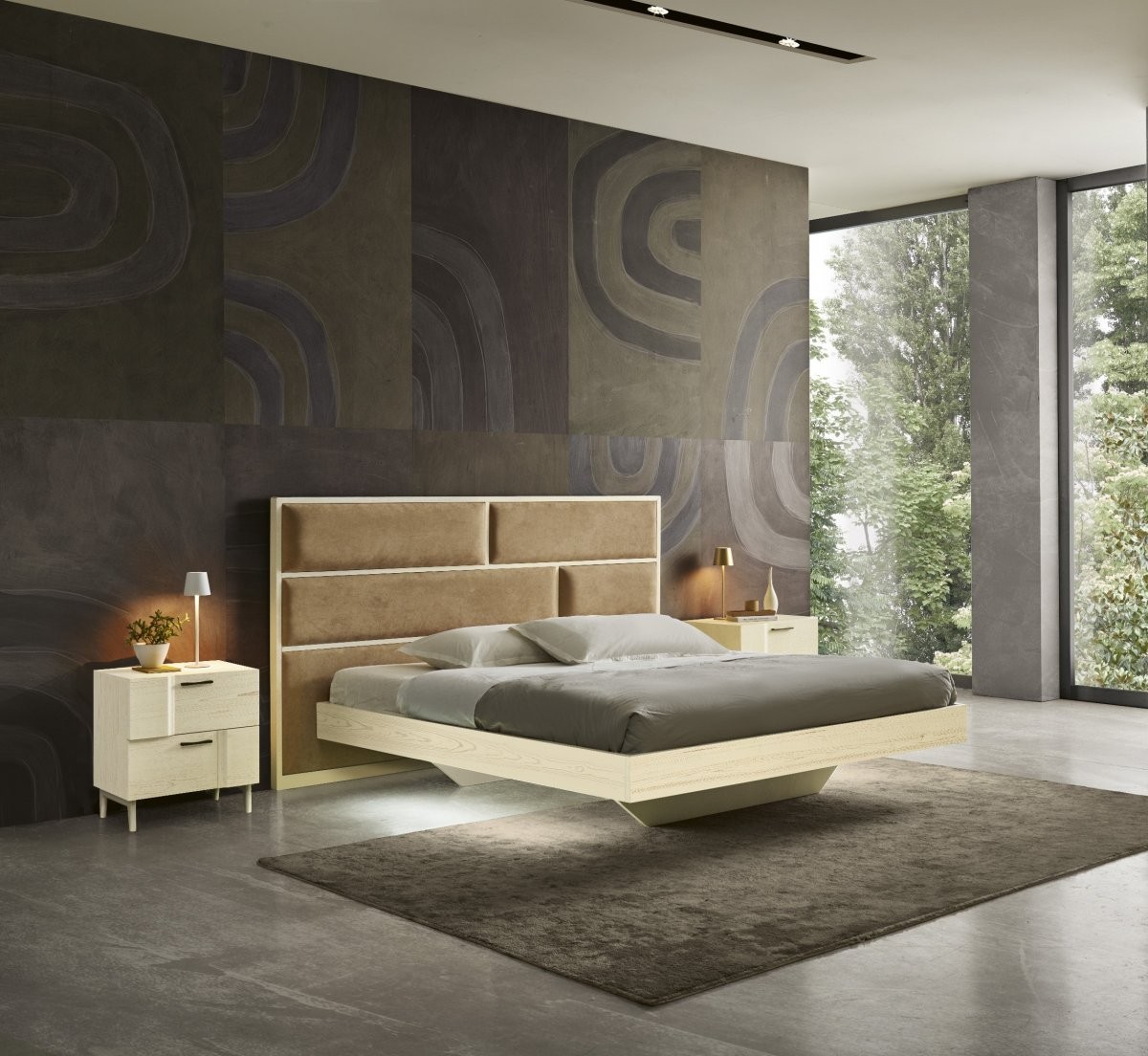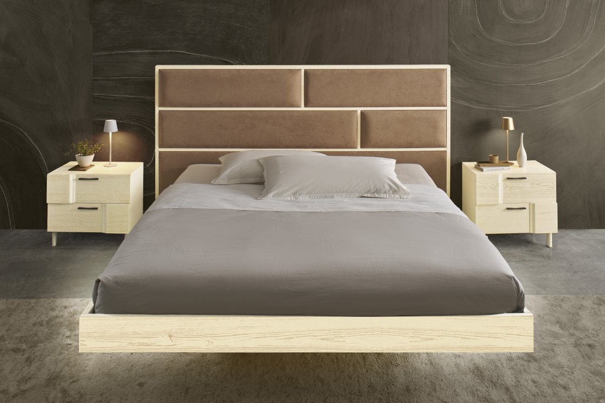 Letto matrimoniale in stile contemporaneo che conferisce un tocco di raffinatezza e calore grazie alla sua eleganza intramontabile che solo il rovere può offrire. L'elemento centrale di questa collezione è sicuramente il pannello imbottito applicato sulla testata per creare un gioco armonioso tra i vari componenti.