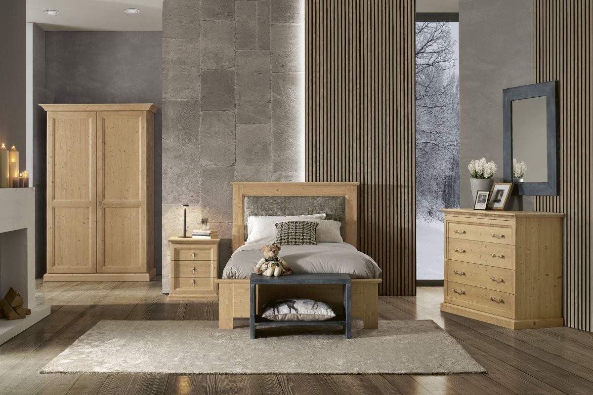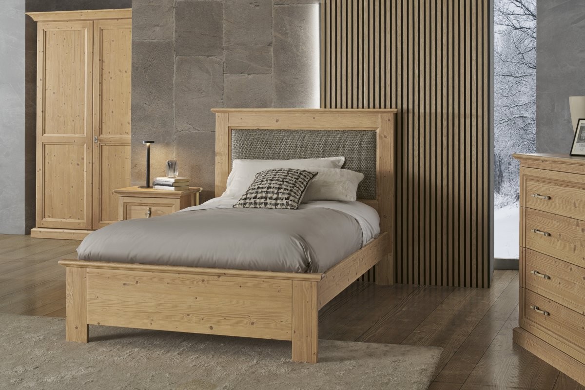 Letto 1 piazza e mezza in stile contemporaneo che conferisce un tocco di raffinatezza e calore grazie alla sua eleganza intramontabile che solo il legno di abete può offrire. L'elemento centrale di questa collezione è sicuramente il pannello imbottito applicato sulla testata per creare un gioco armonioso tra i vari componenti.