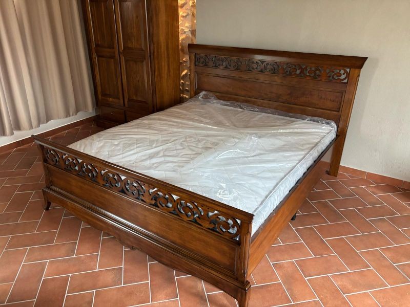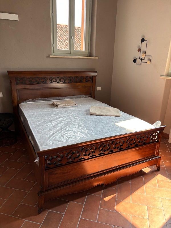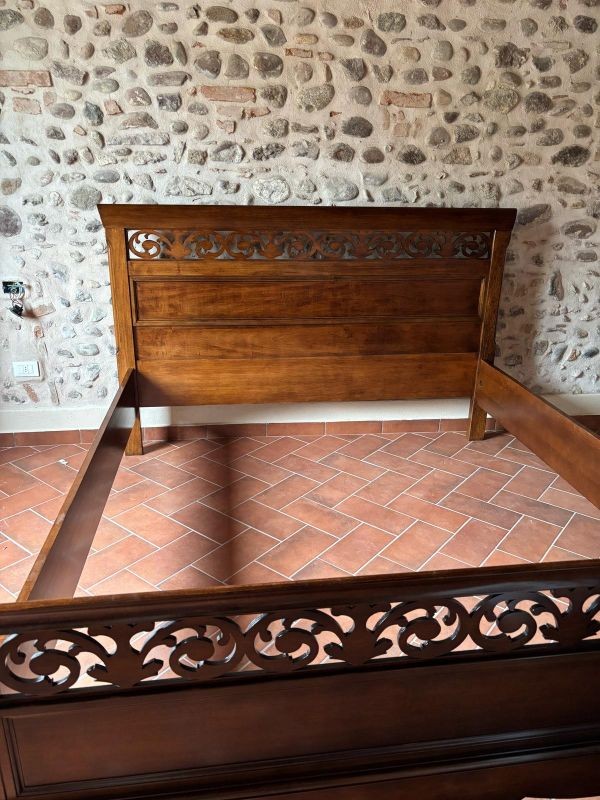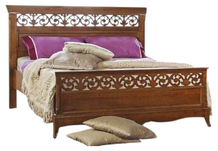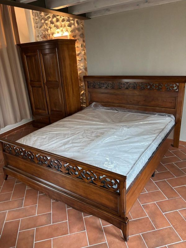 Letto matrimoniale in legno con testata traforata e pediera sagomata . Questa Versione ha il giroletto, solida e robusta. letto dalla linea elegante e di classe . La qualità dei materiali nella realizzazione di questo letto ne garantisce la lunga durata nel tempo.
